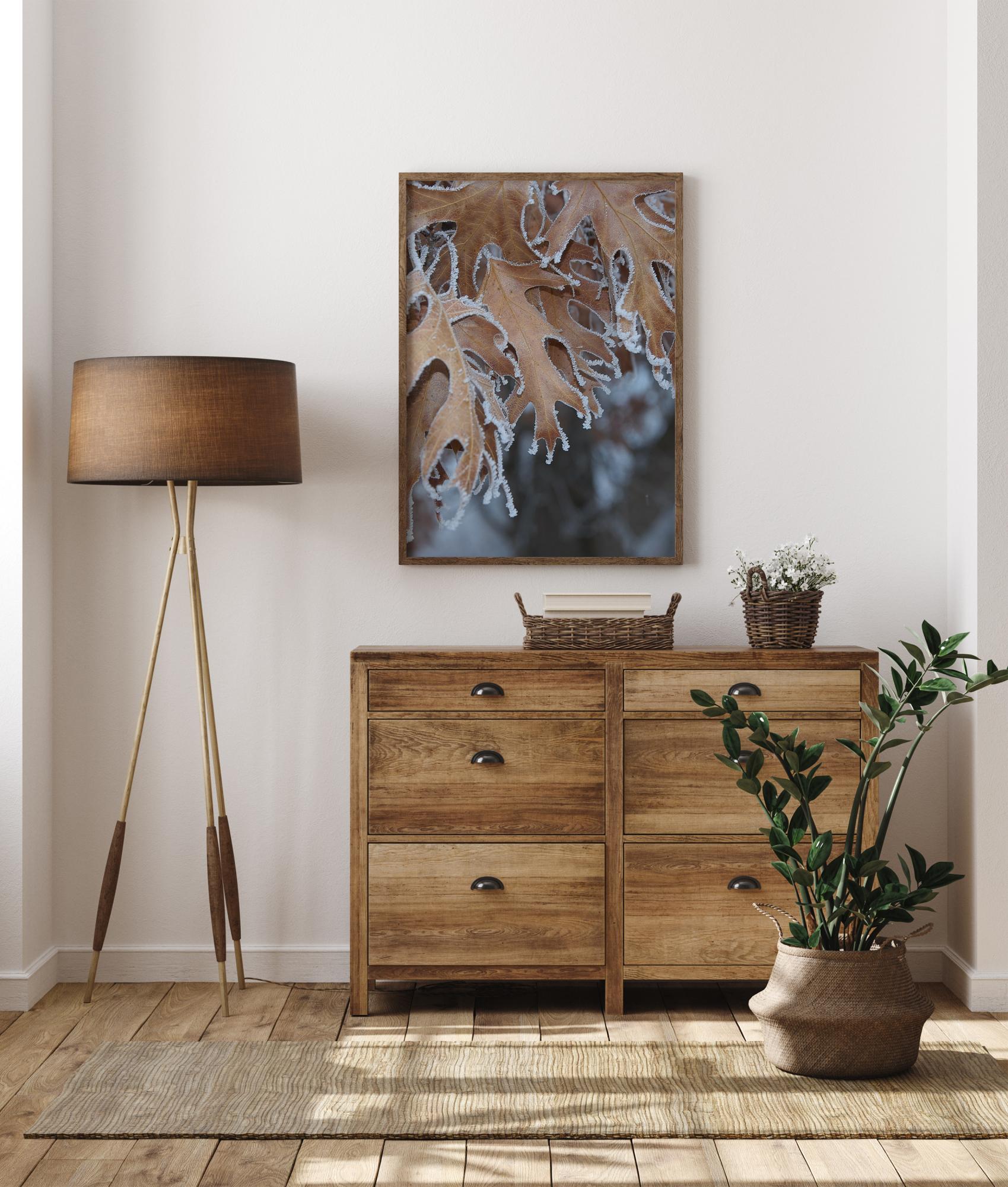Makro plakát s podzimními listy, ohraničený mrazem. Hnědé a suché listy se kroutí v chladu, každý s mrazovým okrajem malých ledových částic, které vytvářejí druh dekorace. Pocítíte mrazivý chlad, když ho pověsíte.