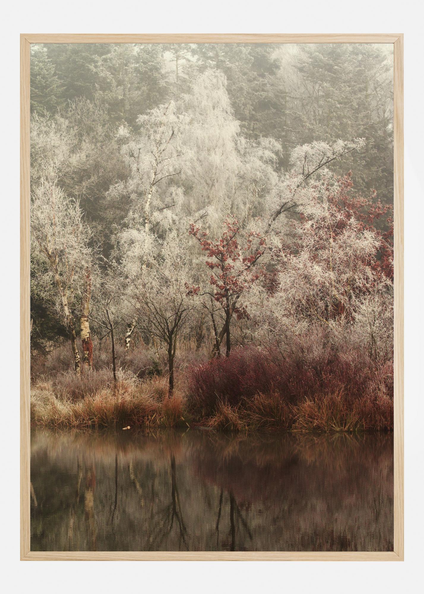 Tichý a klidný plakát se zmrzlou lesní krajinou. V popředí je jasné a klidné jezero s tmavě červenou trávou a mrazem pokrytými stromy v pozadí. Téměř můžete cítit klid a mír, který vyzařuje z tohoto krásného, magického obrázku.