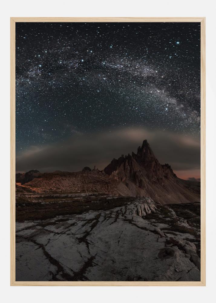 Úžasný plakát s masivem Dolomit s galaxií nad ním. Červené skály se tyčí vysoko směrem ke hvězdám. Mléčná dráha se klene nad ním s hromadou jasně třpytivých hvězd a vytváří magickou scénu. Pověste si ho na zeď a vznášejte se do úžasného světa.