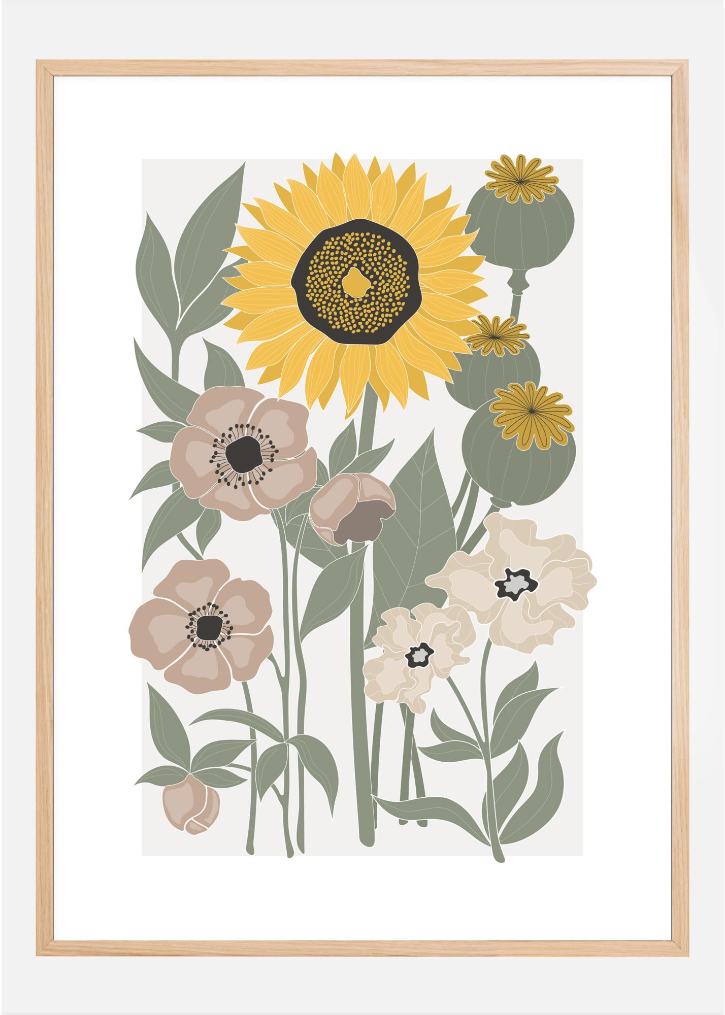 Měkký plakát s různými květinami. Světlá slunečnice dominuje středu obrazu spolu s dalšími květinami, jako jsou máky, na tomto zahradním plakátu. Jednoduchý styl usnadňuje vidět detaily a užívat si tento slunečný obrázek.