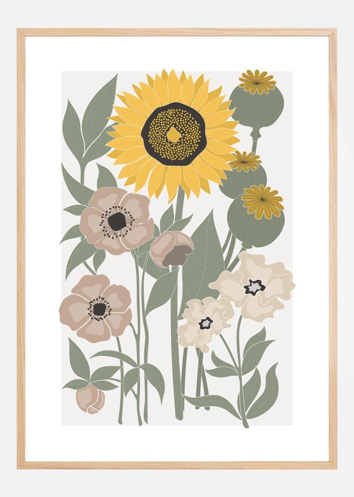 Měkký plakát s různými květinami. Světlá slunečnice dominuje středu obrazu spolu s dalšími květinami, jako jsou máky v tomto zahradním plakátu. Jednoduchý styl usnadňuje vidět detaily a užít si tento slunečný obraz.