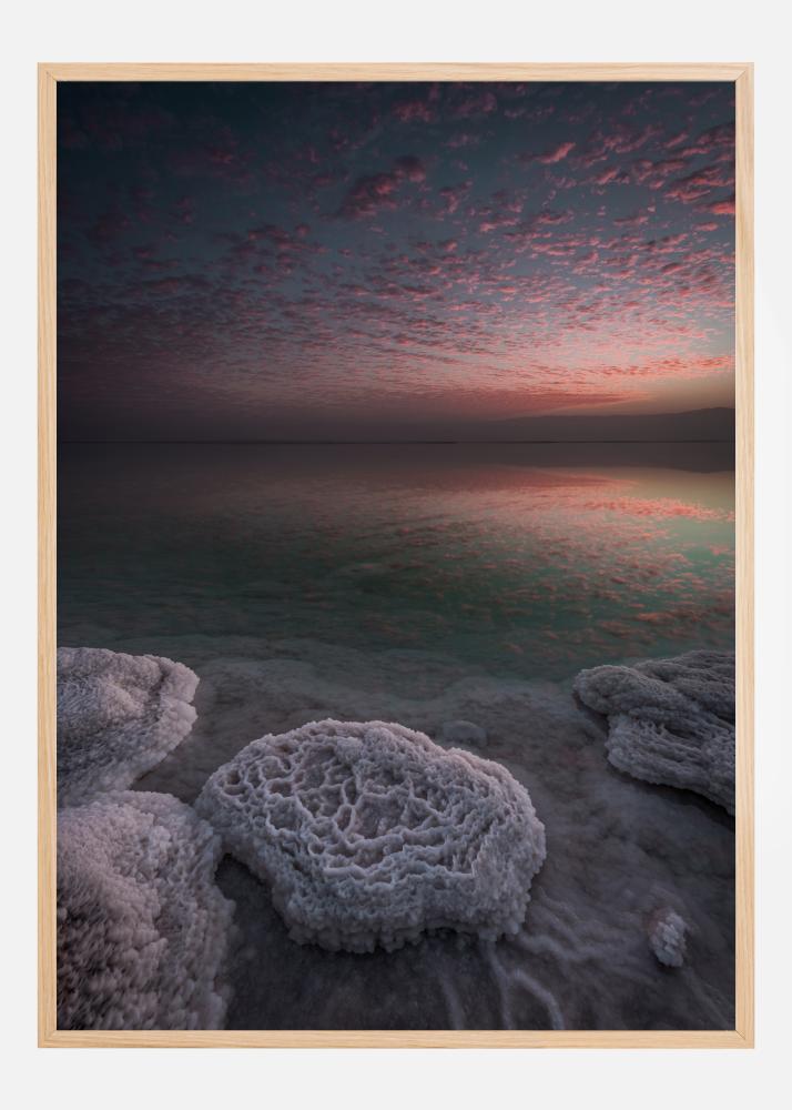 Krásný plakát s rozlehlým jezerem. V popředí vznikly velké krystaly soli, které vytvářejí úžasné přírodní vzory. Jezero se rozprostírá směrem k obzoru, zatímco dramaticky červená a modrá noční obloha přispívá k magickému pocitu tohoto obrazu.
