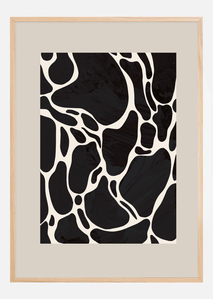 Grafický plakát se skvrnami žirafy v černé a bílé barvě. Velké barevné bloky v černé vytvářejí poutavý obraz, zatímco tahy štětcem v nich dodávají další strukturu. Silné bílé linie protínají skvrny žirafy a vytvářejí tok a pohyb v obrazu.