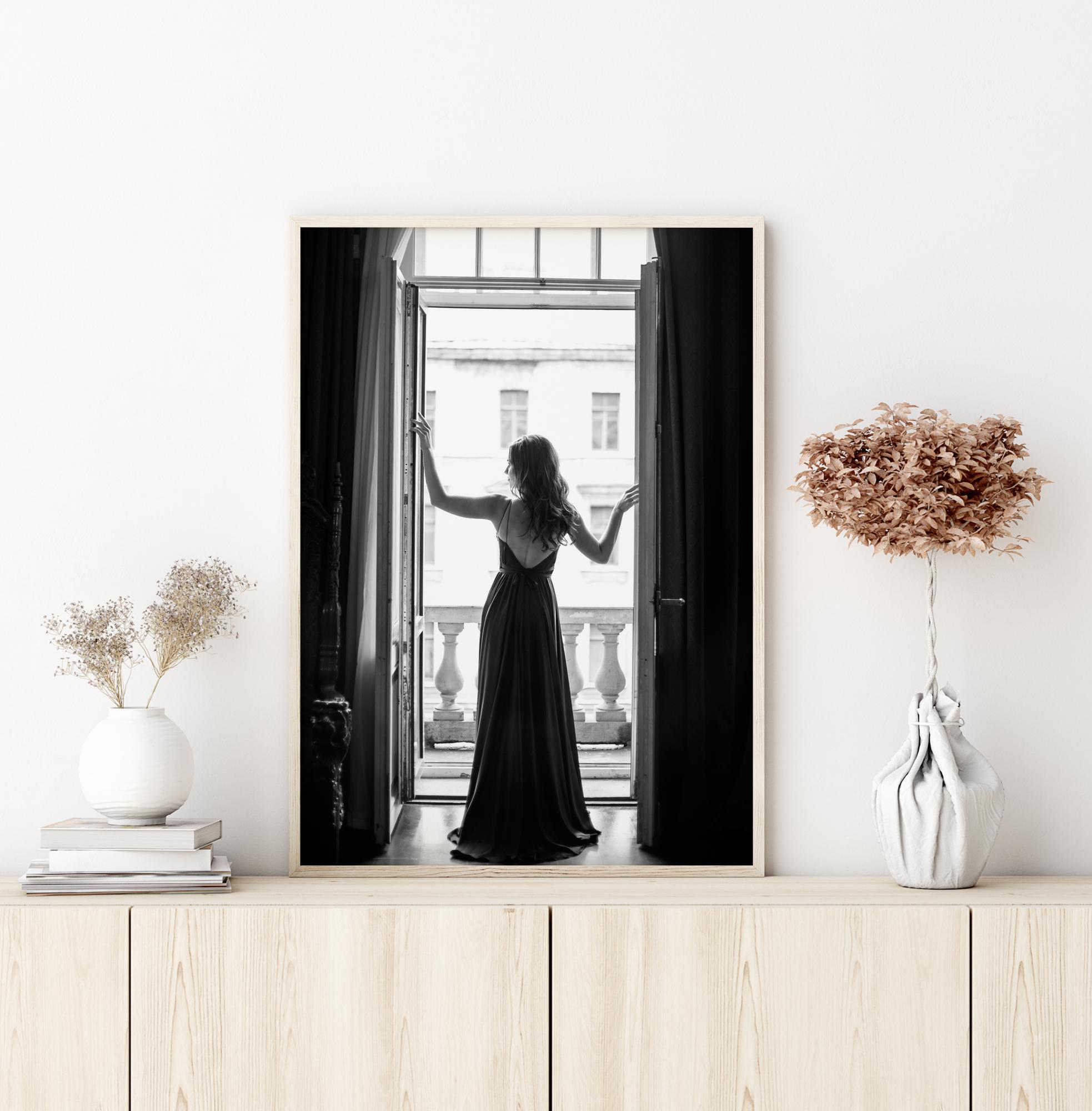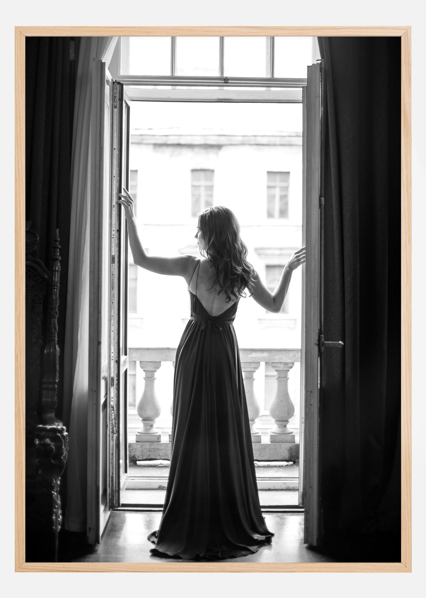 Černobílá fotografie ženy v dlouhých šatech stojící u široce otevřených balkónových dveří, dívající se ven na den. Před ní se rýsují opotřebované betonové sloupy a opotřebovaná stará fasáda. Plakát, který dýchá nádhernou směsicí krásného a živého v kontrastu proti starému a povětrnostním vlivům vystavenému.