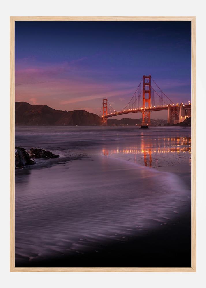 Noční plakát Zlaté brány. Zlaté lampy osvětlují tento slavný most a odrážejí se ve vodě pod ním. Část pláže je v popředí, voda vede oko k mostu a úžasné modro-zlaté obloze, kde zapadá slunce. Ponořte se do tohoto úžasného nočního obrazu.