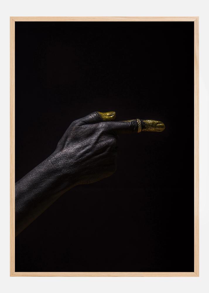 Umělecký plakát s rukou ukazující prstem jako pistolí. Většina ruky je namalována černě, ale prsty jsou zlaté až k prvnímu kloubu. Ruka ukazuje jako pistole doprava a vyniká na černém pozadí. Zavěste ji na krémově zbarvenou zeď pro skutečně dramatický vzhled.