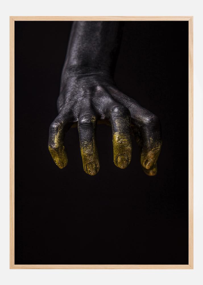 Dramatický plakát lepkavé ruky, která se natahuje dolů. Černá ruka vstupuje shora na fotografii, prsty ohnuté připravené něco uchopit. Špičky prstů jsou pokryty třpytivým zlatem, aby vynikly. Přidejte tento epický obraz do svého domova.