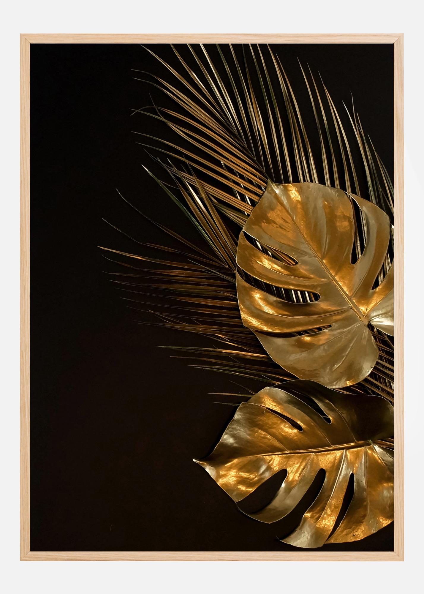 Přírodní plakát se světlými zlatými listy na černém pozadí. Zlaté listy z Monstery a zlatě zbarvené kapradinové listy vyplňují tento úchvatný obraz. Lesk zlata vytváří záři, která navzdory černému pozadí osvětluje místnost s elegantním, ale přesto slavnostním pocitem.