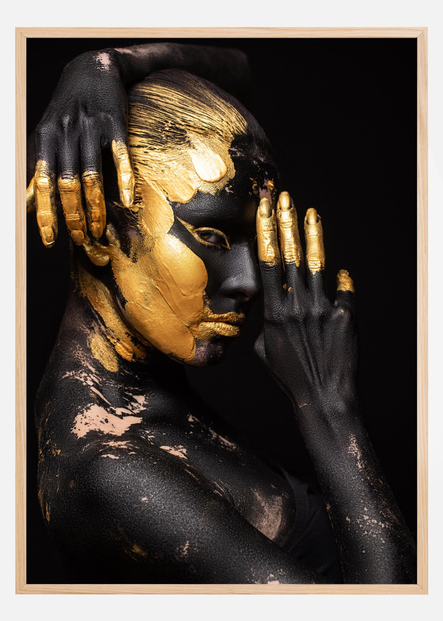 Zářivý portrétní plakát s profilem ženy, která drží ruku před obličejem, druhou ruku má přetaženou přes hlavu. Žena je malovaná černou a zlatou barvou, aby vytvořila dramatický efekt a zdůraznila různé části jejího těla, zatímco vás pozoruje koutkem oka.