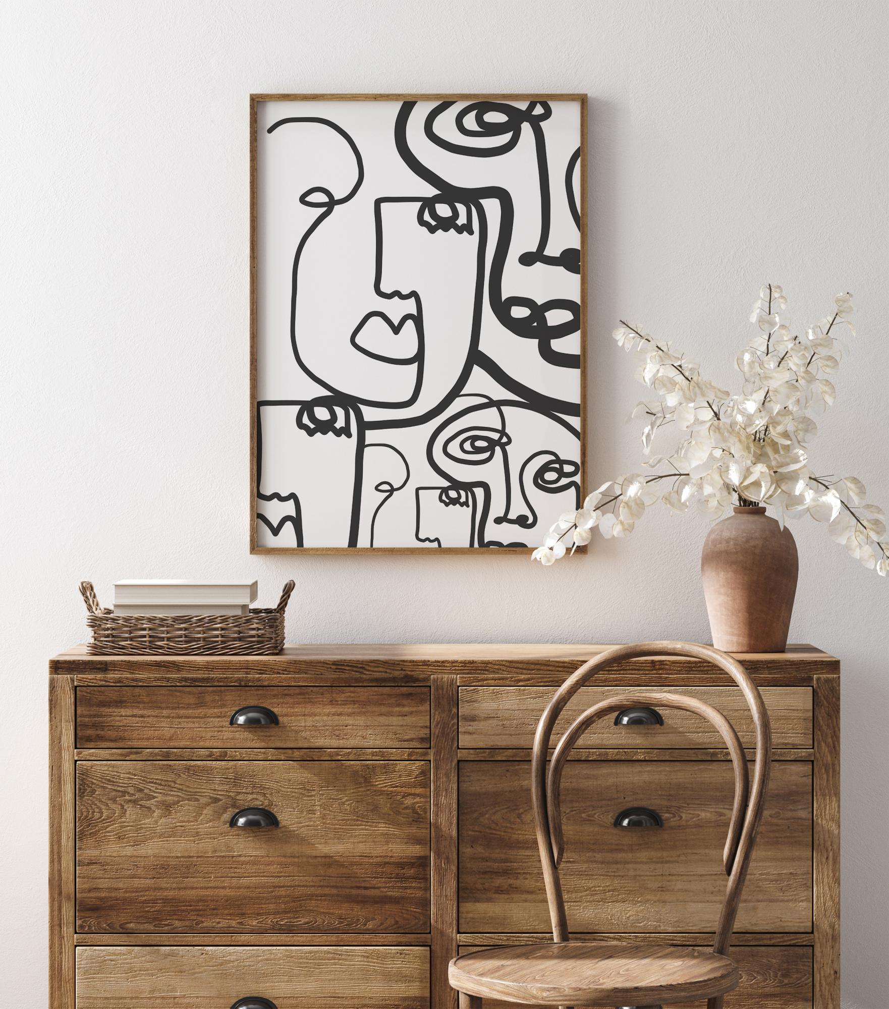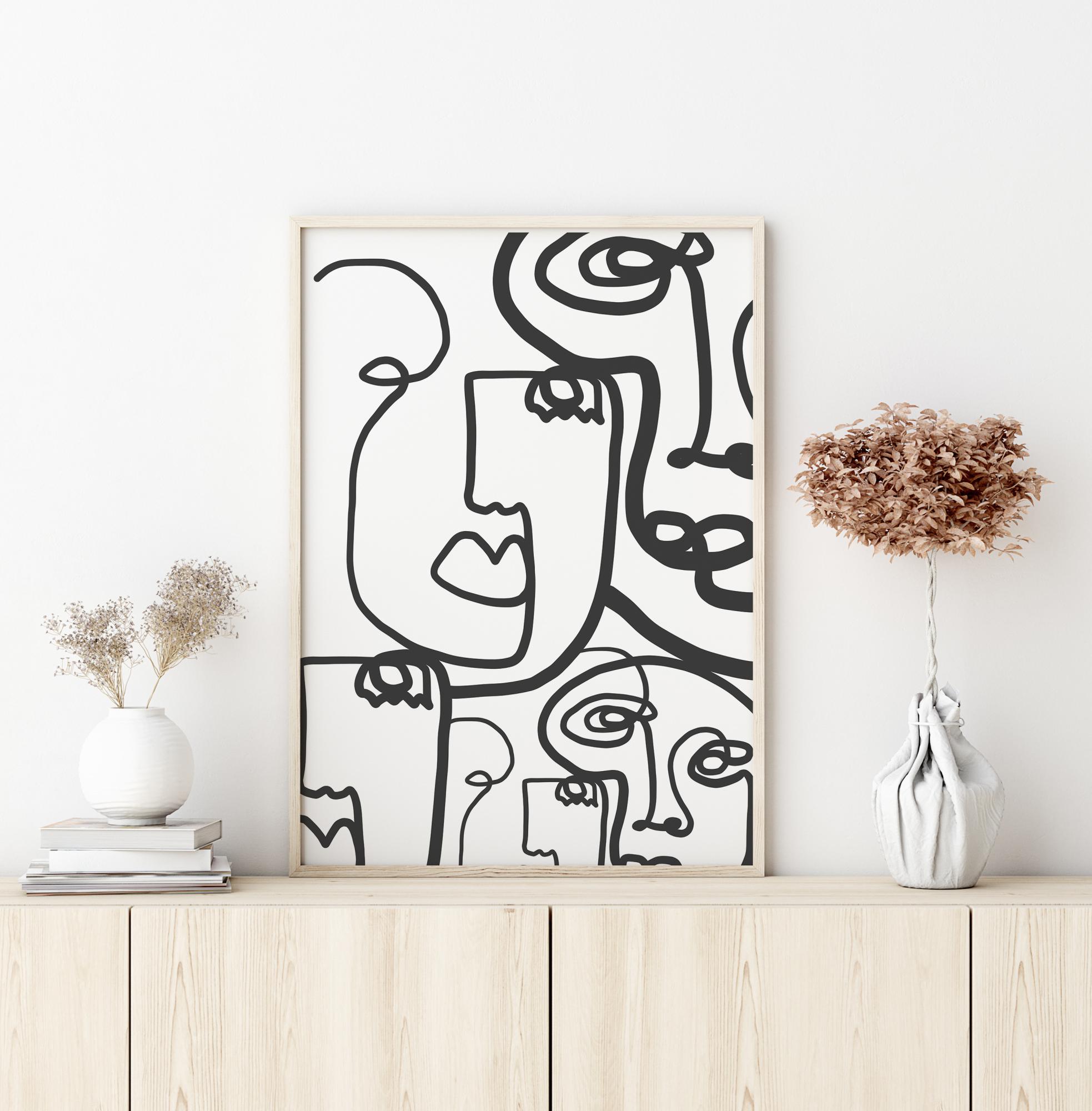 Dramatický abstraktní plakát s množstvím kreslených obličejů. Silné a tenké černé čáry zaplňují tento obraz a vytvářejí pět samostatných obličejů. Čáry se točí kolem bílého pozadí, takže se musíte soustředit, abyste našli všechny obličeje, které se skrývají v tomto živém obrazu.