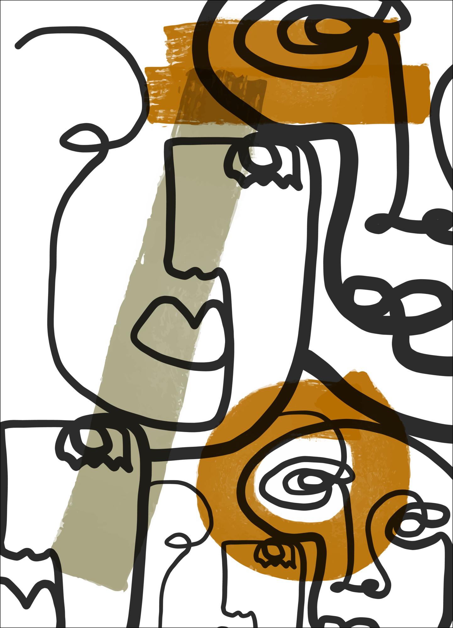Grafický plakát s liniovým uměním se tvářemi namalovanými černou barvou na pozadí v bílé, šedé a hnědé barvě. Abstraktní a živý plakát, který se dokonale hodí do moderního domova a vynikne stejně dobře v kuchyni a předsíni jako v obývacím pokoji nebo ložnici.