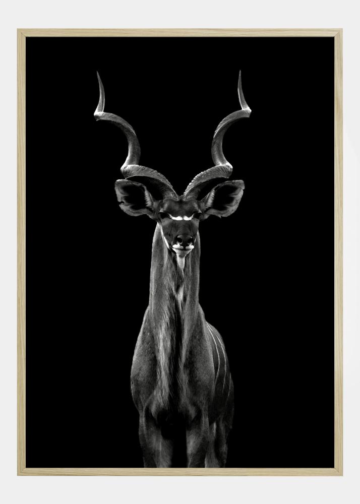 Plakát s divočinou s větším kudu, stojícím majestátně na černém pozadí. Tato majestátní antilopa zírá do kamery, zatočené rohy směřují vzhůru a zaplňují obraz. Přidejte tento úžasný černobílý portrét zvířete do svého domova pro nádech velkoleposti.