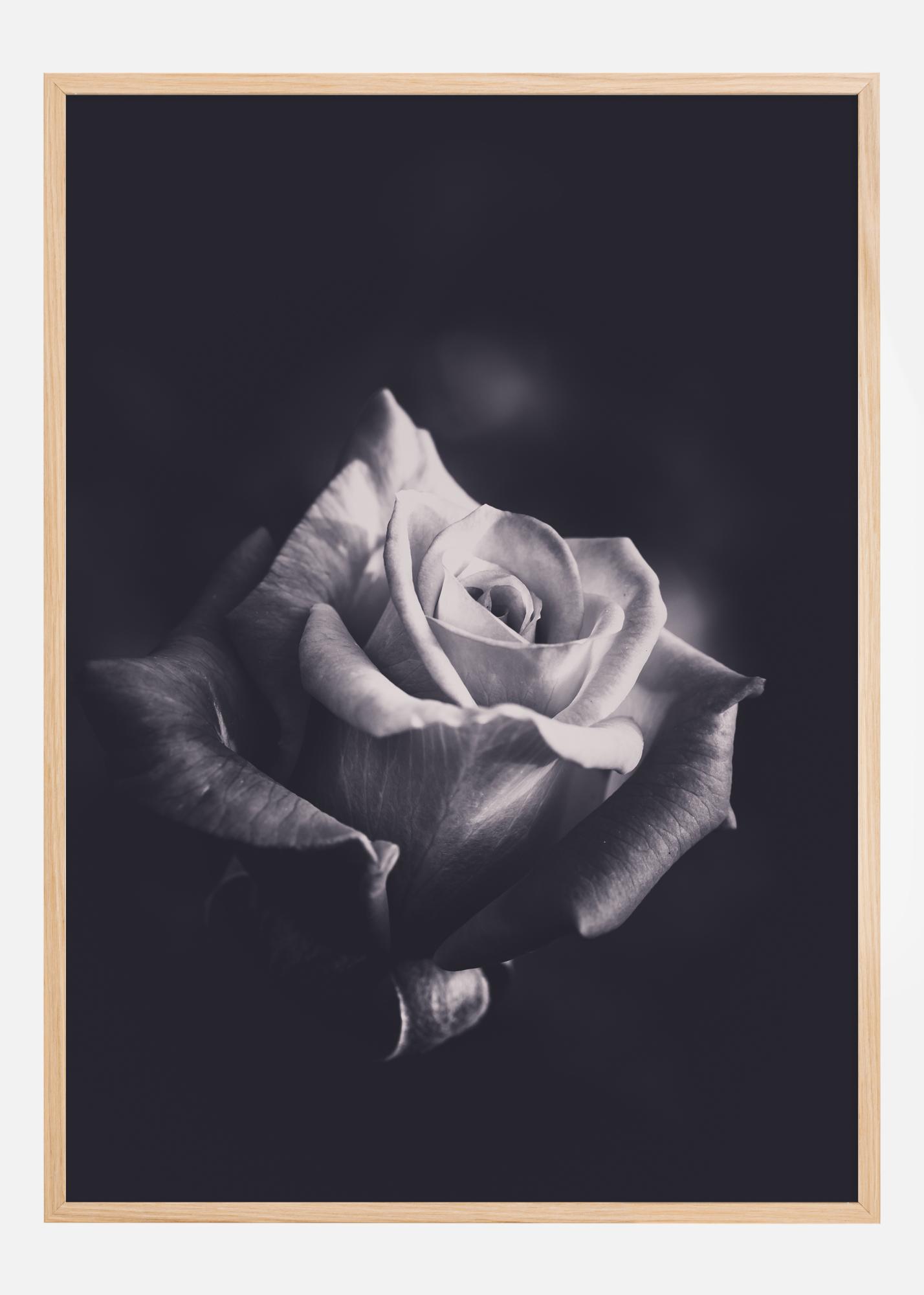Tento sofistikovaný plakát zachycuje esenci krásy v její nejčistší formě s jedinou šedivou růží. Její okvětní lístky se elegantně rozvíjejí směrem ven, vytvářejí symetrický a přitažlivý tvar, který je jak jemný, tak silný. Obrázek je hluboce detailní, s měkkými přechody od světla ke stínu, které zdůrazňují přirozenou krásu struktury růže.