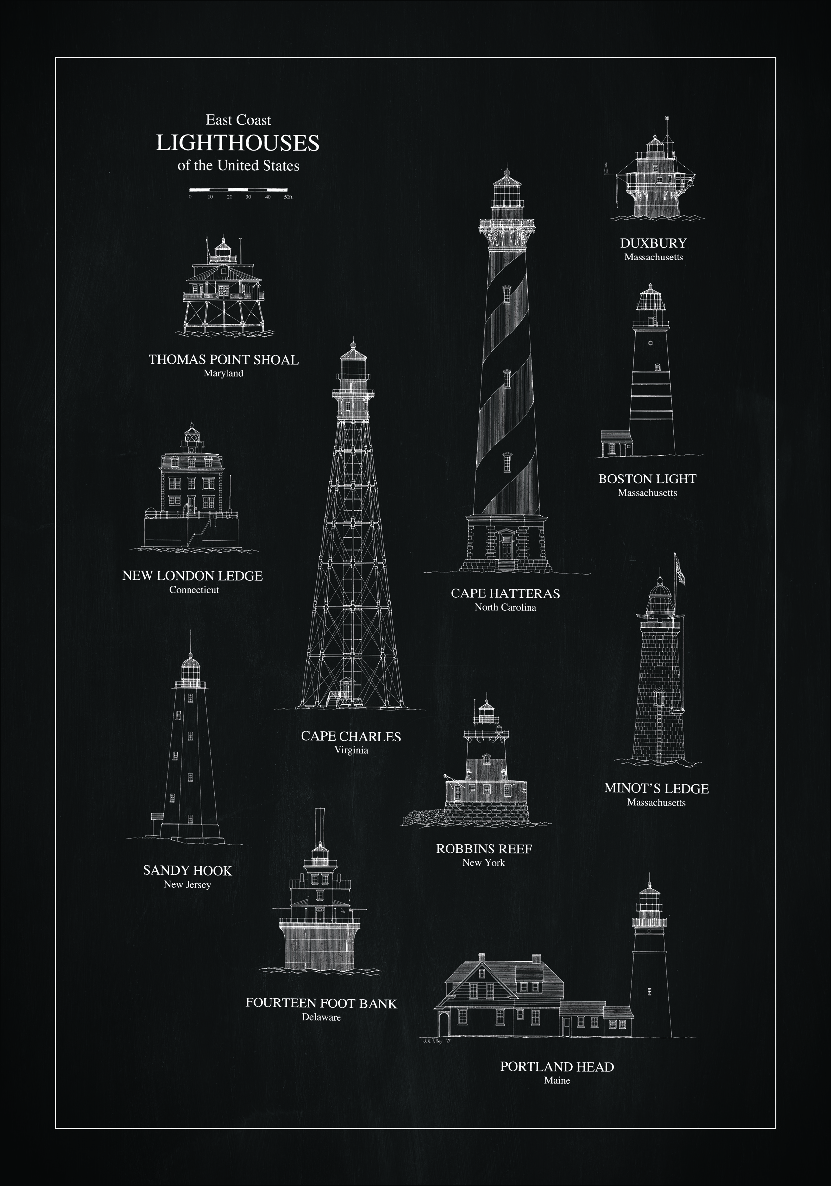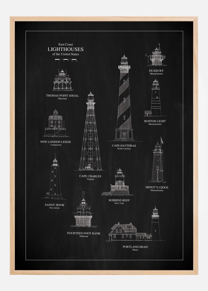 Nechte své stěny následovat námořní vintage téma a ozdobte je našimi plakáty s motivy majáků a lodí! Tento originální plakát připomíná černou tabuli s lahodným motivem, který vypadá, jako by byl nakreslený tenkou bílou křídou. Motiv zobrazuje 11 krásných majáků, které se nacházejí podél východního pobřeží USA. Sen pro vás, kteří milují architekturu a kresby! Protože plakát je k dispozici v různých velikostech, snadno najdete takový, který se hodí právě do vašeho domova. Rád doplňte bílým nebo zlatým rámečkem.