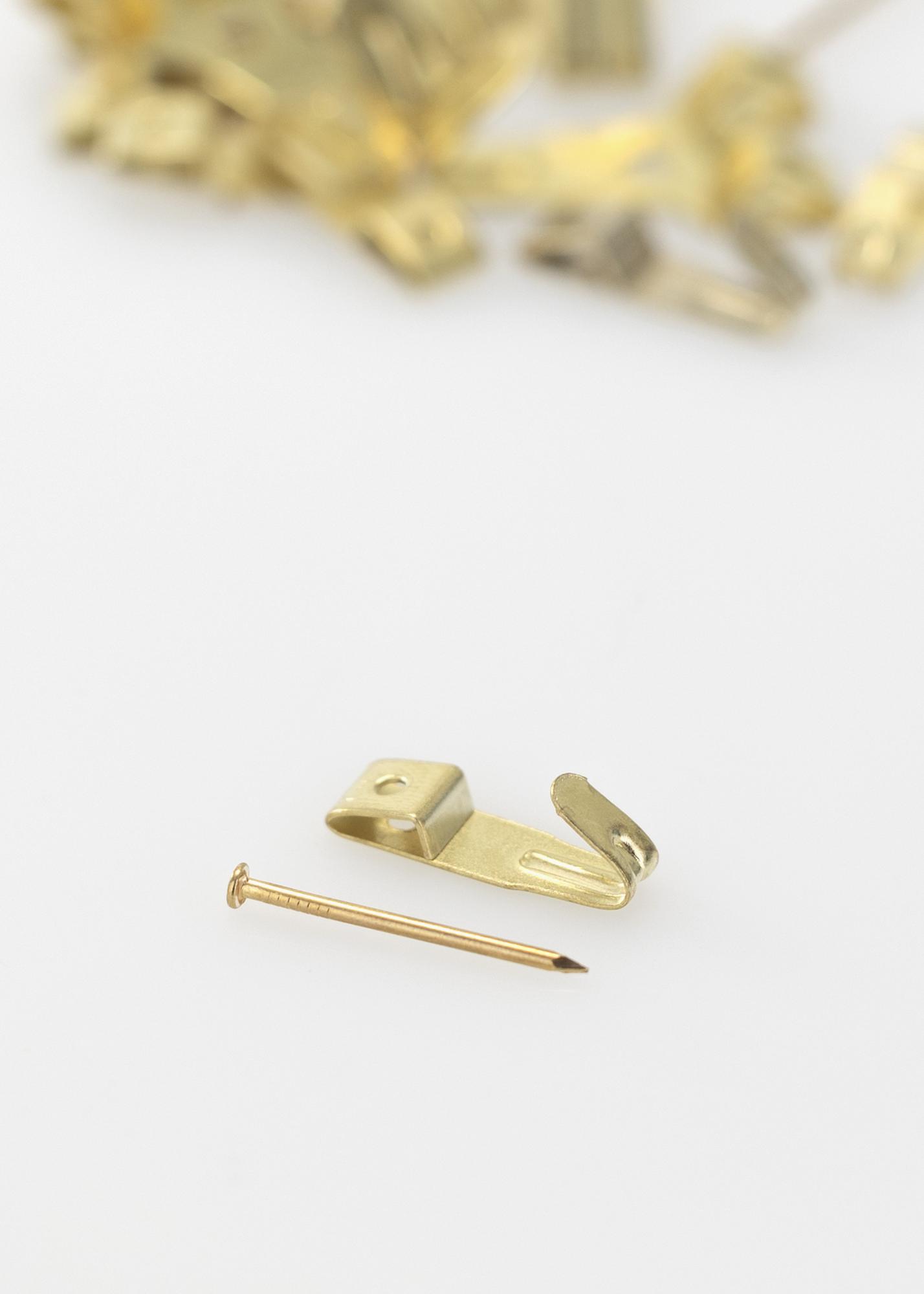 Mosazný X-hák pro montáž do dřeva nebo sádrokartonové stěny. Vydrží zatížení až 5 kg.