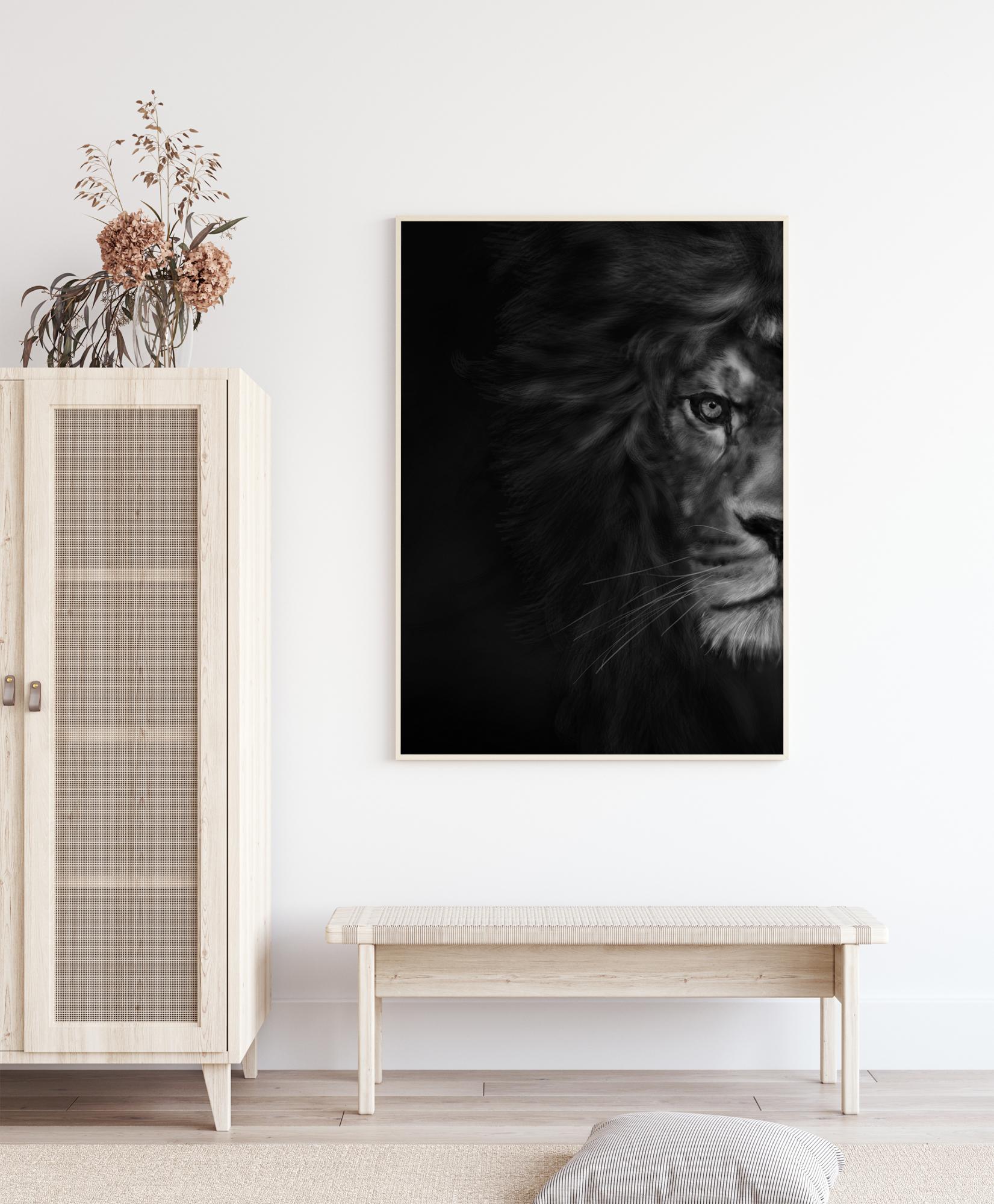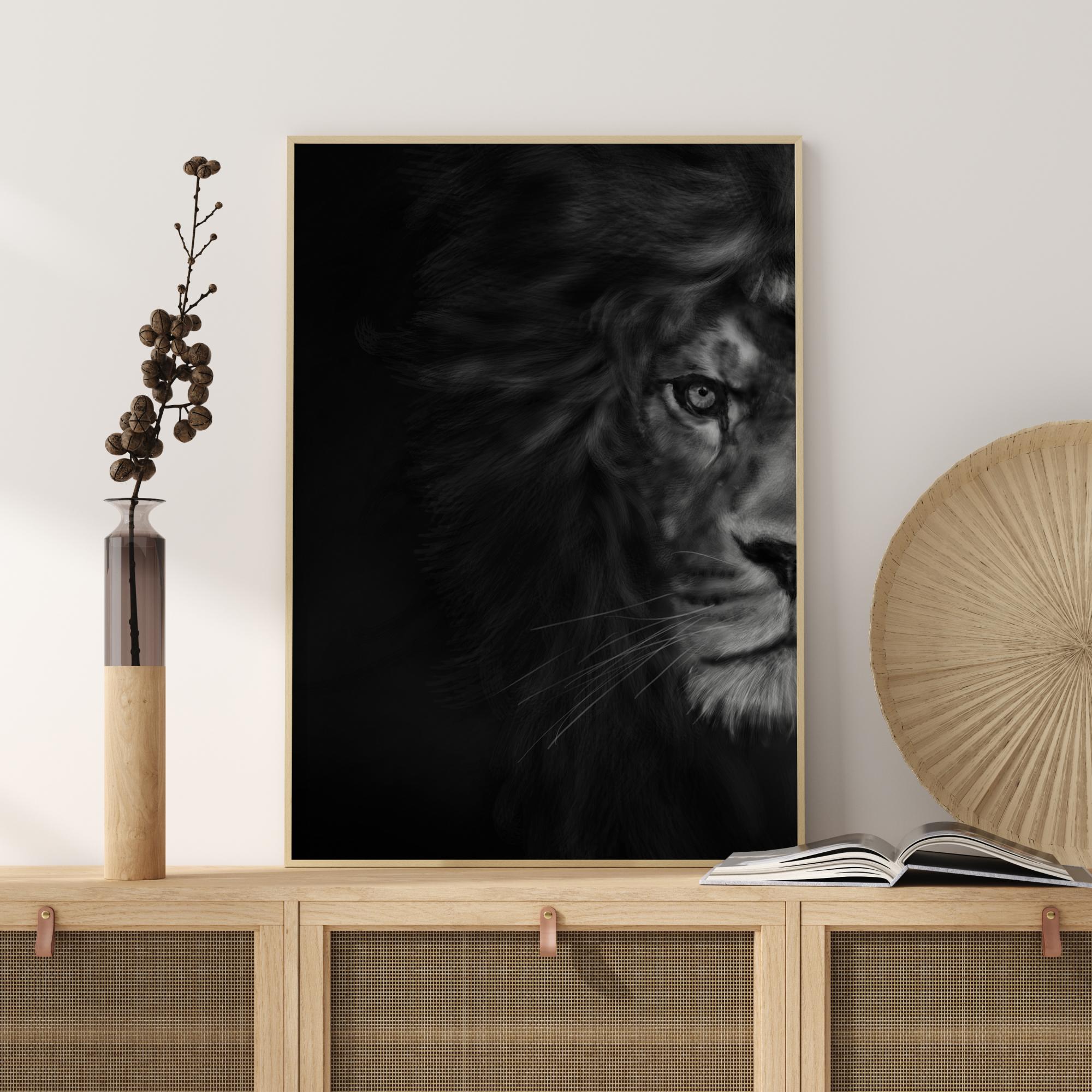 Působivý černobílý přírodní plakát s divokým lvem, který přímo hledí do objektivu fotoaparátu. Umístěním napravo od tisku je vidět pouze polovina obličeje lva. S jeho krásnou vlnitou hřívou a majestátním postojem jej lze jistě definovat jako krále džungle. Přineste si do domova pocit safari.
