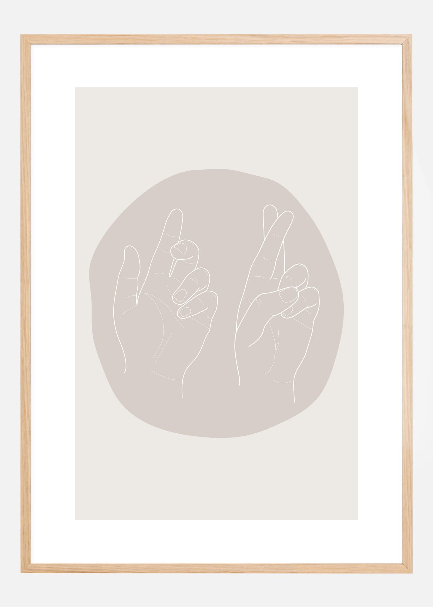 Jednoduchý plakát dvou levých rukou proti kulaté béžové formě. Kruh byl umístěn na tělově zbarveném pozadí s oběma rukama směřujícími k hornímu okraji plakátu. Ruce jsou uvolněné a vytvářejí klidnou atmosféru ve vašem domově. Perfektní obraz pro vaši pracovnu.