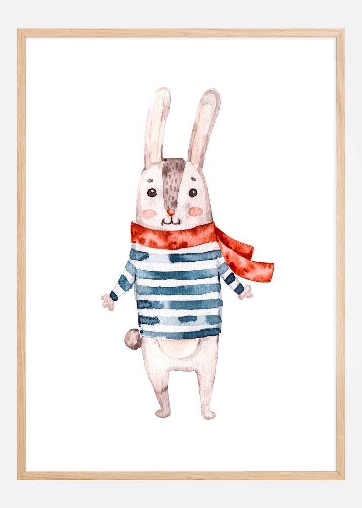 Tento půvabný plakát zobrazuje veselého králíka oblečeného v pruhovaném svetru a vlající červené šále. Králíkův teplý úsměv a hravý postoj vyzařují radost a nevinnost, což vytváří srdečný a přívětivý pocit. Ilustrace, zhotovena v jemných akvarelových tónech, má lehkost a jednoduchost, která poskytuje dojemný a nostalgický efekt.