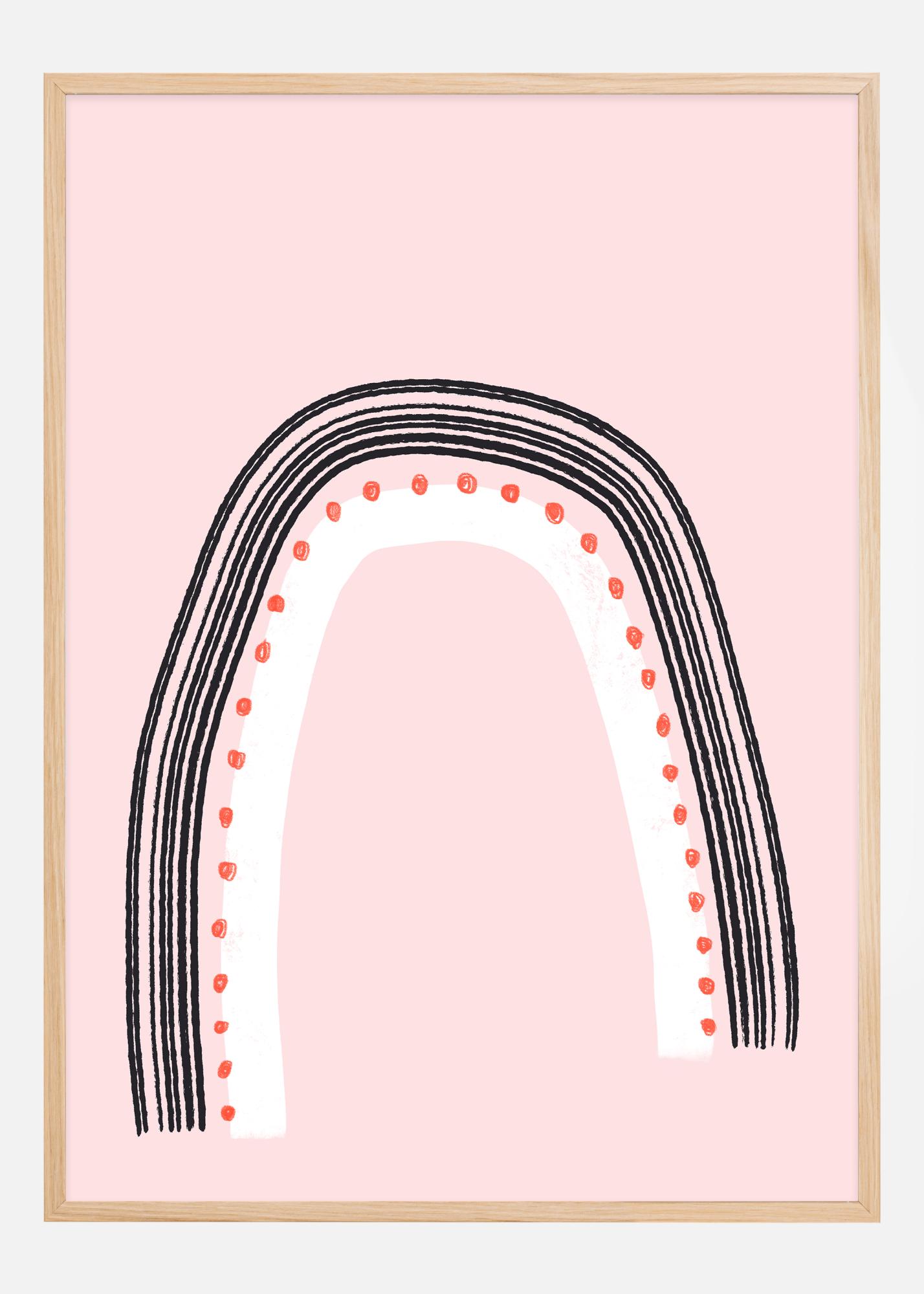 Tento hravý a okouzlující plakát zobrazuje stylizovanou duhu s moderním a grafickým přístupem. Na světlě růžovém pozadí vytvářejí výrazné, černé obrysy oblouků duhy zřetelný kontrast, zatímco řady malých, červených srdcí sledují jednu z křivek, což dodává neodolatelný pocit radosti a pozitivnosti. Tento tisk vyzařuje jednoduchost a radost a může rozzářit jakoukoli místnost svým šarmem a přátelskou aurou.