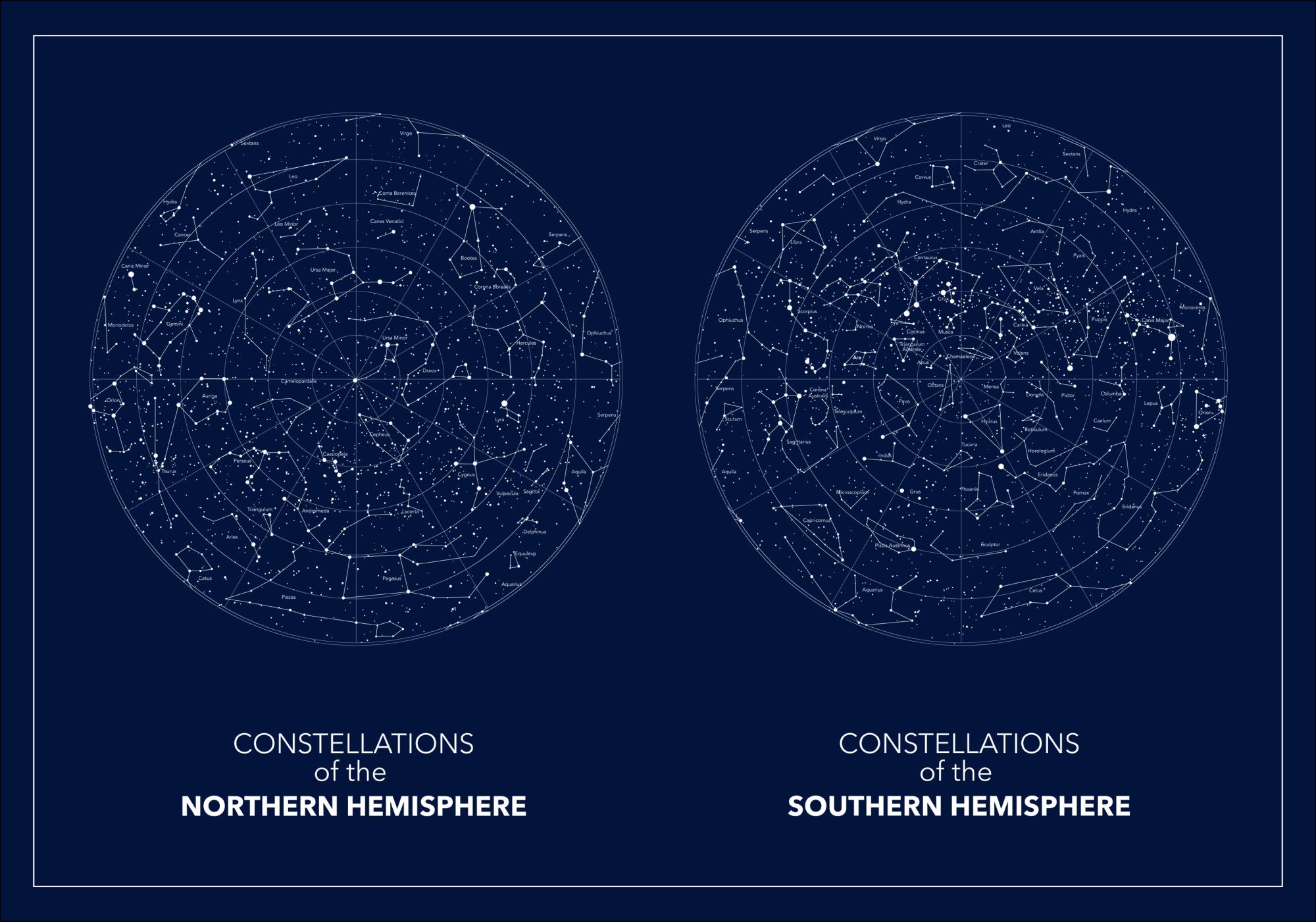 Fascinující tmavě modrý plakát s jižní a severní hvězdnou oblohou. Oba obrazy jsou umístěny vedle sebe. Na tmavě modrém pozadí jsou souhvězdí jemně ohraničena bílou barvou. Zavěste si tento obraz ve své pracovně a vytvořte pocit nekonečna.
