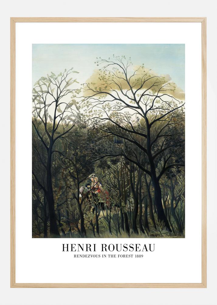 Tento úchvatný plakát s názvem 'Rendezvous v lese' z roku 1889 je dílem Henriho Rousseaua, které zachycuje tajné setkání v bujném lese. Ideální pro ty, kteří hledají umělecký tisk, který je jak klasický, tak záhadný, obraz zobrazuje zvláštní scénu, kde se postava v červeném zdá splývat s okolní vegetací. Hlavní barvy tohoto díla jsou symfonií zelené, varijící od hlubokého mechu po jemné, bledé odstíny, které se doplňují a přidávají pocit hloubky a rozměru lesnímu prostředí. Vzdušné odstíny béžové a modré otevírají oblohu a vytvářejí dojem rozlehlé krajiny, která je jak klidná, tak lákavá.