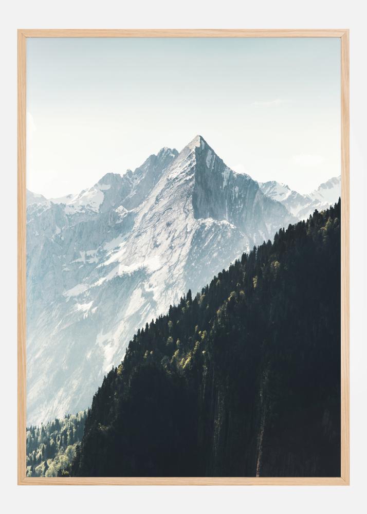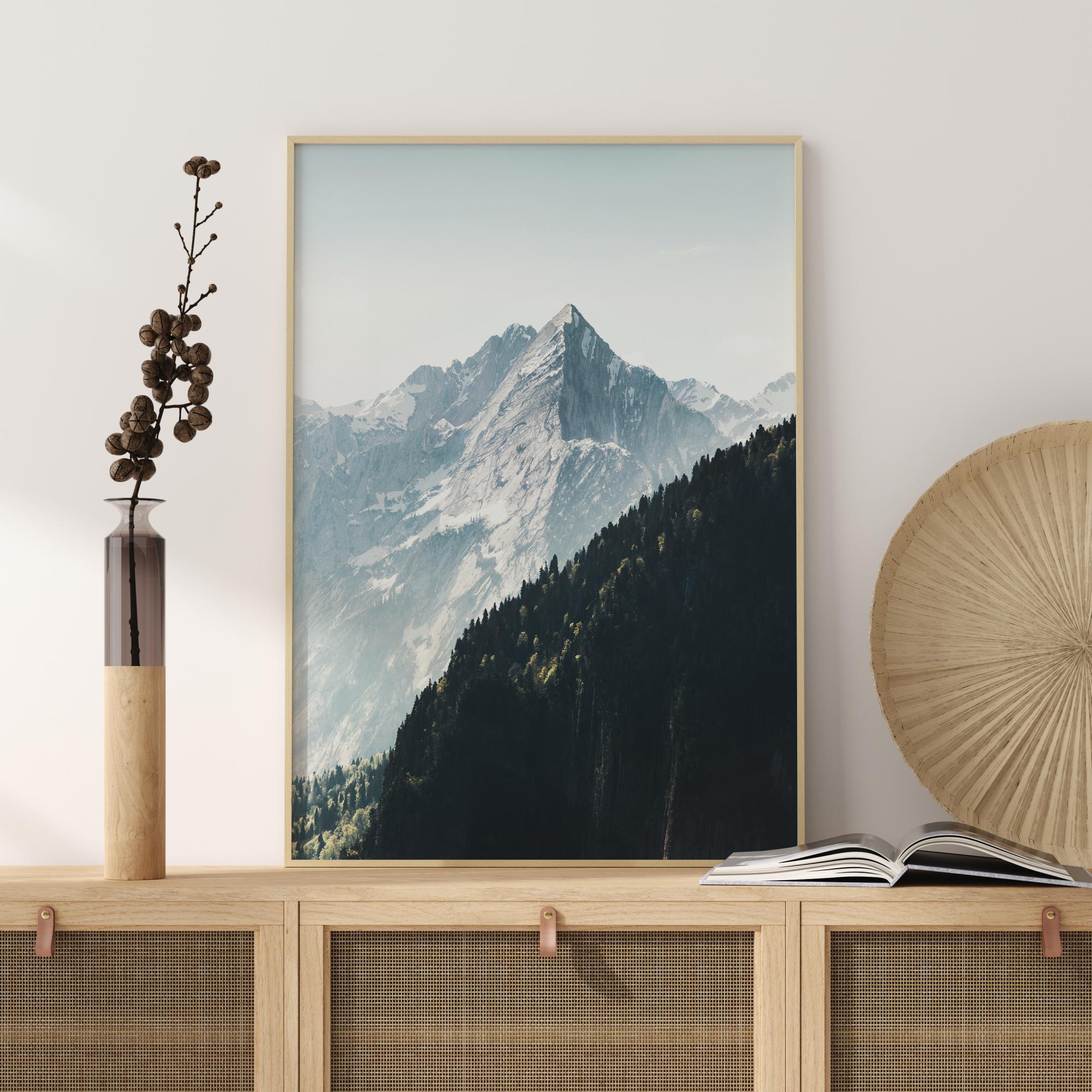 Malebná krajinná scéna se zasněženými horami proti světle modré obloze. V popředí částečně zakrývá výhled na hory tmavě zelený les a vytváří krásnou zimní atmosféru. Ideální plakát k zavěšení nad krb.