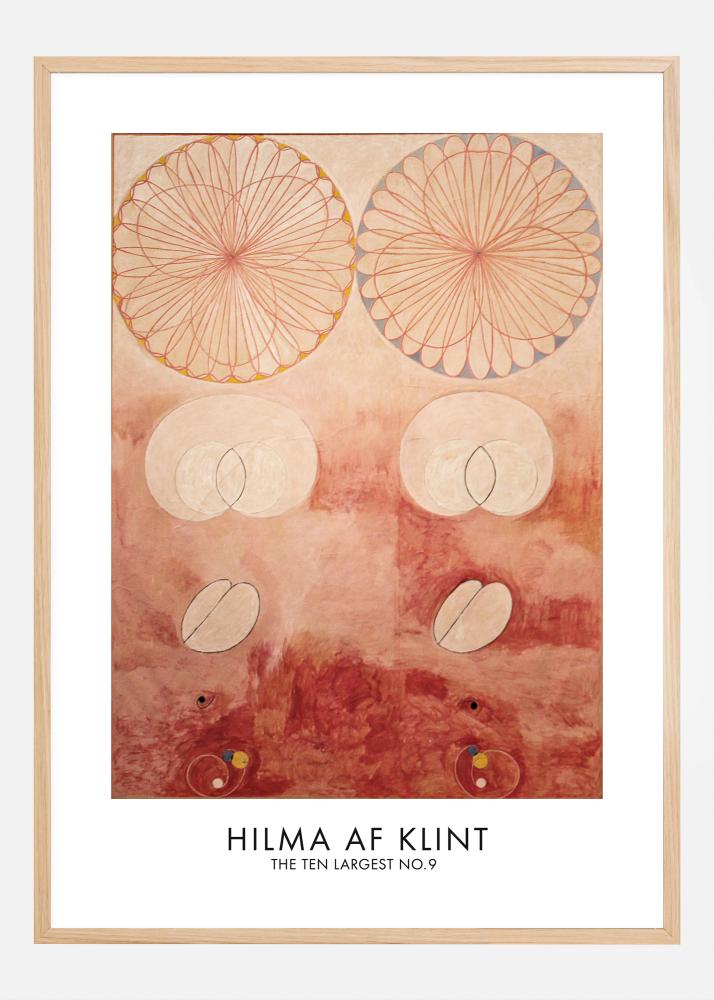Tento plakát 'The Ten Largest No.9' od Hilmy af Klint je hypnotizující mix geometrie a organických tvarů, který ilustruje umělcovu fascinaci kosmickým a duchovním. Dvě dominantní kruhy, vyplněné zářícími liniemi na teplém růžovém a terakotově zbarveném pozadí, vytvářejí okamžitou vizuální atrakci. Pod nimi je řada menších kruhů a spirálních tvarů, které přidávají hloubku a složitost kompozici. Tento umělecký tisk je odrazem af Klintovy schopnosti spojit vědu a duchovnost v jeden obrazový prostor a nabízí otevřené pole pro divákovy vlastní interpretace a vnitřní zkoumání.