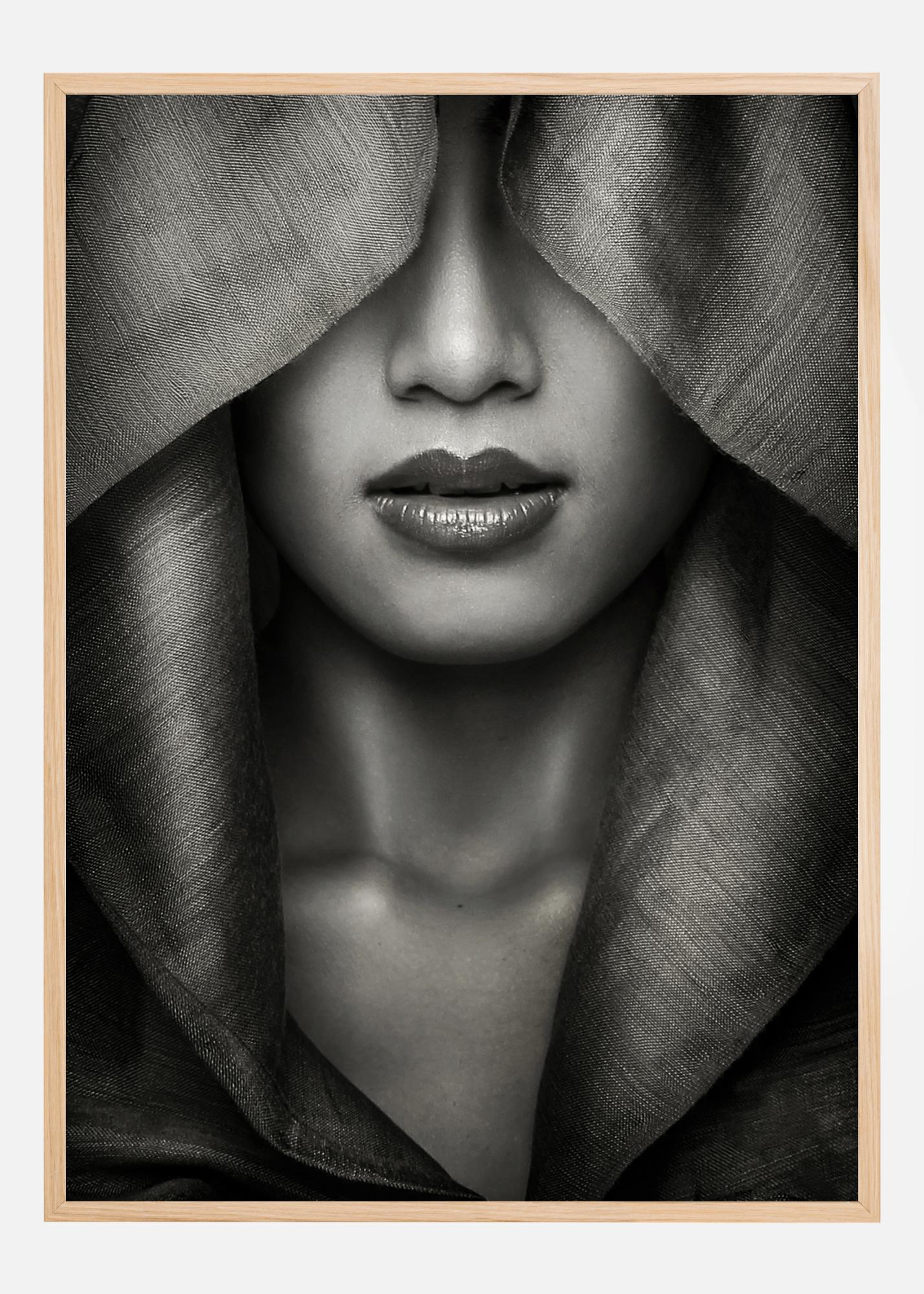 Obrázek zobrazuje silný a poutavý detail osoby zahalené v látce, se zaměřením na výrazné rty a silnou linii čelisti. Detailní texturace látky a jemné stíny na pokožce přidávají hloubku a složitost, která vtahuje diváka do motivu. Monochromatická paleta zdůrazňuje každý detail a vytváří nadčasový pocit.
