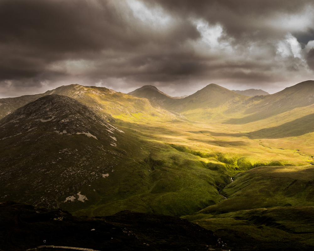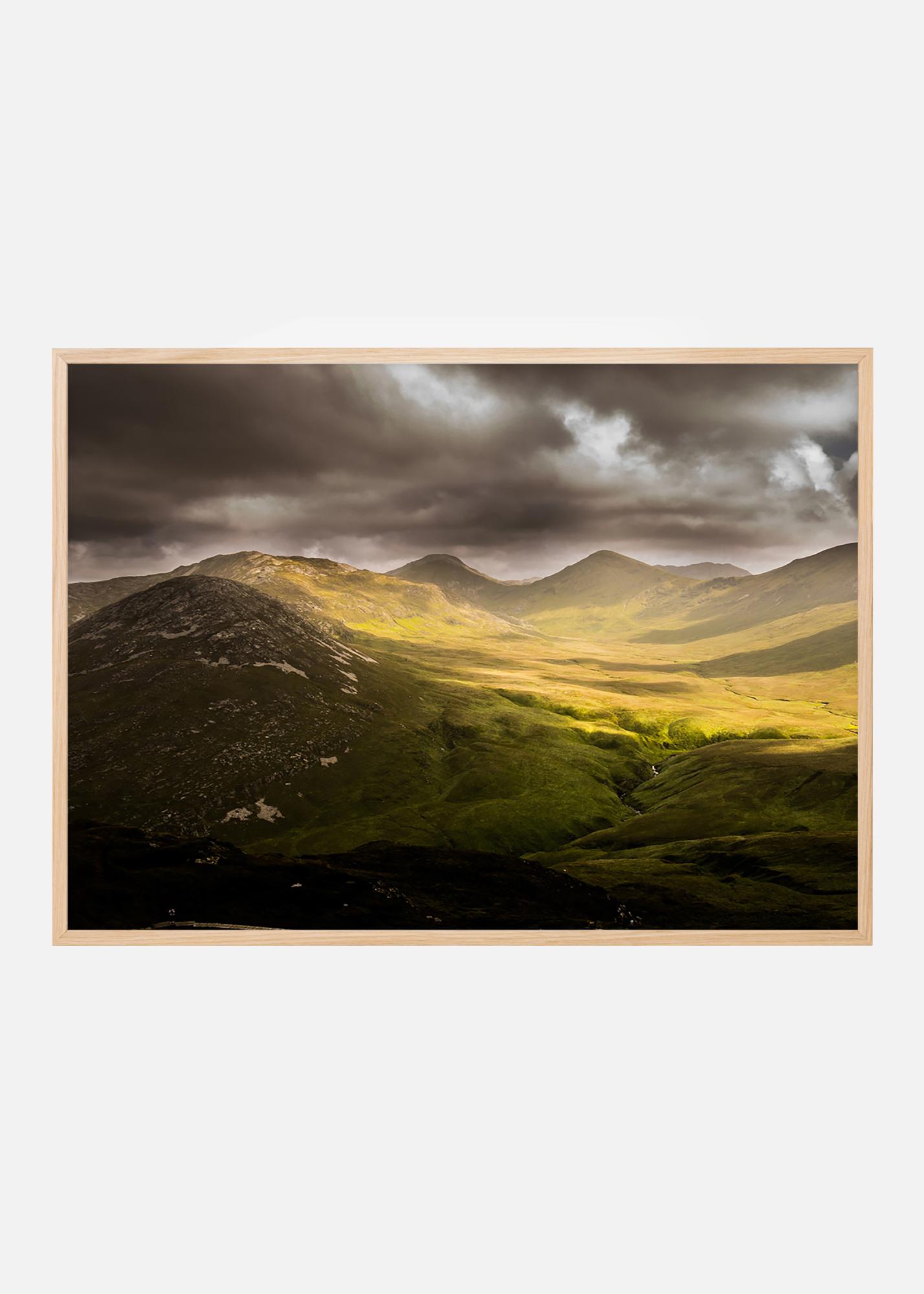 Dramatický krajinářský portrét s bouřkovými mraky, které se tyčí nad pohořím, zatímco slunce osvětluje údolí pod ním. Tlumené barvy podtrhují dramatičnost obrazce a dodávají fotografii skutečnou výjimečnost. Nejlépe vynikne v rámu, který zvýrazní hloubku snímku a nepoutá pozornost od motivu.