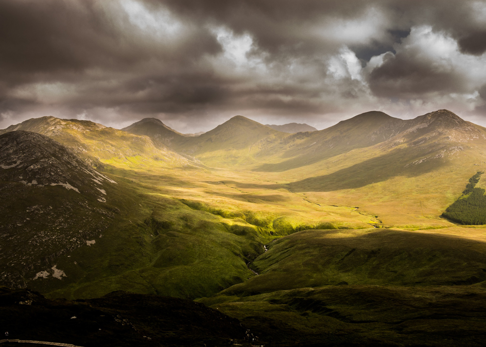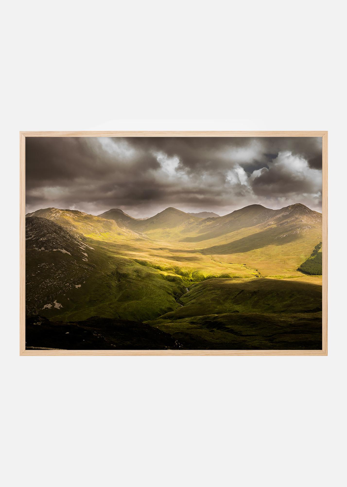 Dramatický portrét krajiny s bouřkovými mraky, které se tyčí nad pohořím, zatímco slunce osvětluje údolí dole. Tlumené barvy podtrhují dramatičnost obrazu a činí fotografii skutečně výraznou. Nejlépe se hodí do rámu, který zvýrazní hloubku obrazu a nepoutá pozornost od motivu.
