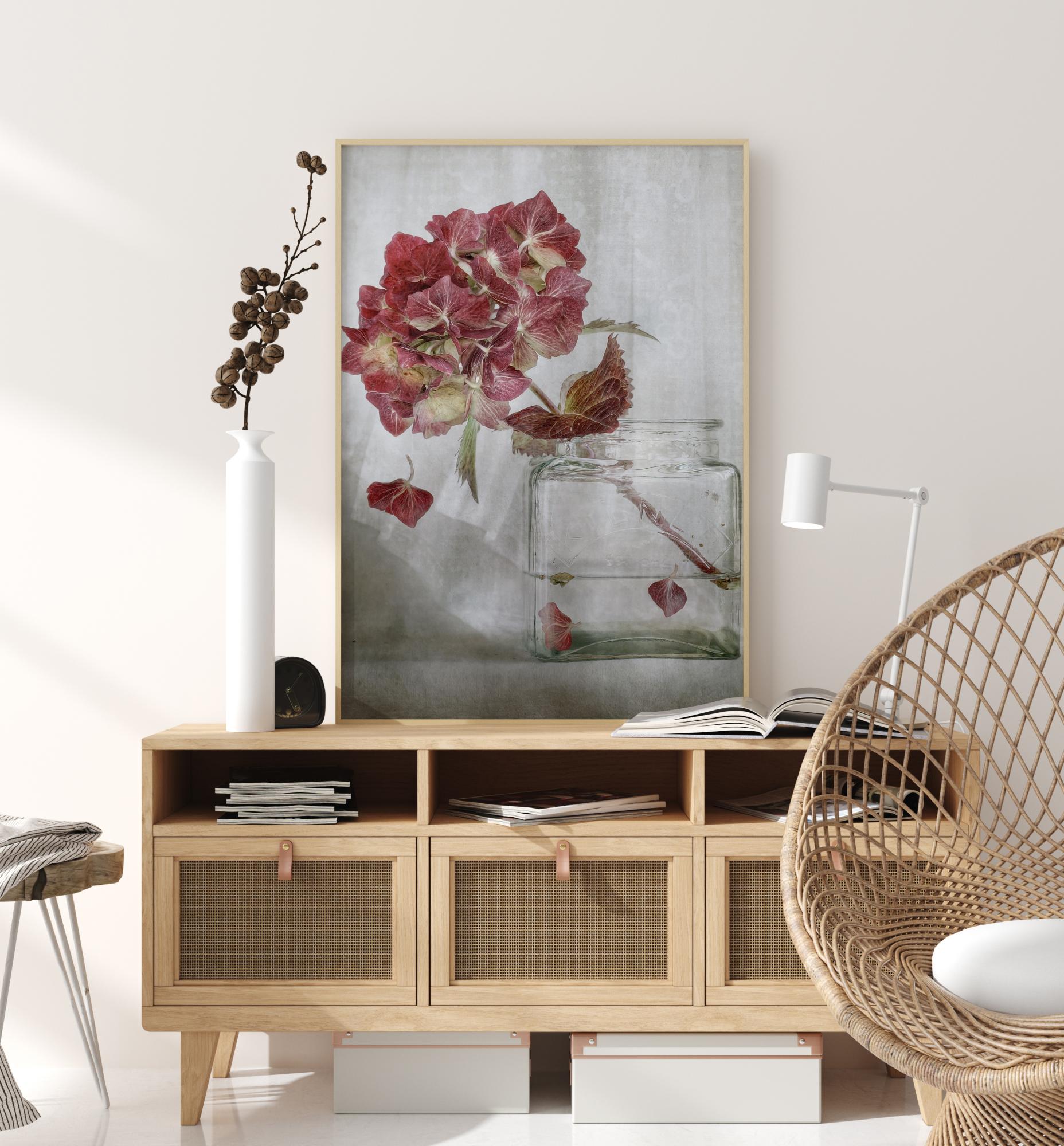 Krásný přírodní plakát s větvičkou hortenzie v průhledné váze. Před květinovým bílým závěsem padá jemný růžový okvětní lístek. Závěs se vlní v lehkém vánku. Tento obraz vás téměř nechá pocítit vánek.