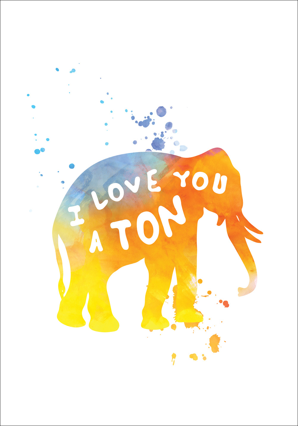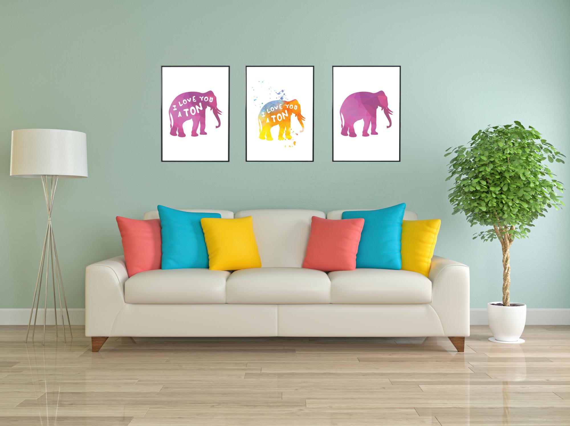 Láskyplný a zábavný plakát, který je vhodné darovat tomu, kdo má rád slony a chce mít na stěně barevný prvek. Slon vypadá, jako by byl vytištěn s nadbytkem barev na bílém papíře, s textem v bílém písmu s rukopisným dojmem. Plakát je hezké zarámovat do elegantního jednobarevného rámu, který zdůrazňuje odstíny motivu a dobře se hodí k ostatnímu zařízení v místnosti, kde bude obraz zavěšen.
