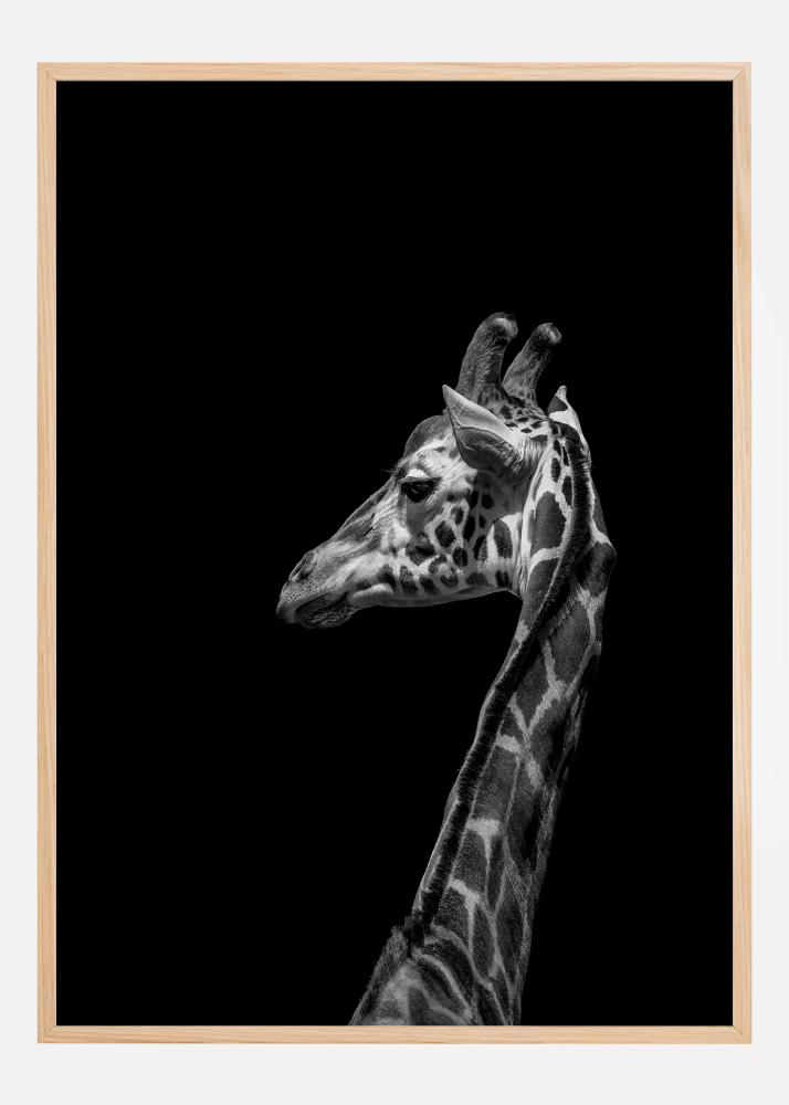 Tento odvážný a výrazný plakát představuje majestátní žirafu proti černému pozadí, což vytváří dramatický kontrast, který poutá pozornost diváka. Jedinečný vzor žirafy v odstínech šedi je dovedně zachycen, s každou skvrnou a linií, které jsou zdůrazněny v detailu. Bohatost detailů v textuře kůže žirafy a jemné odstíny šedé proti černému pozadí vytvářejí téměř trojrozměrný efekt.