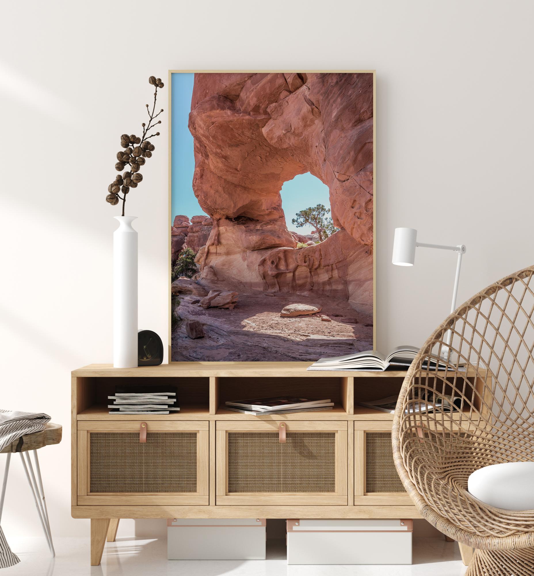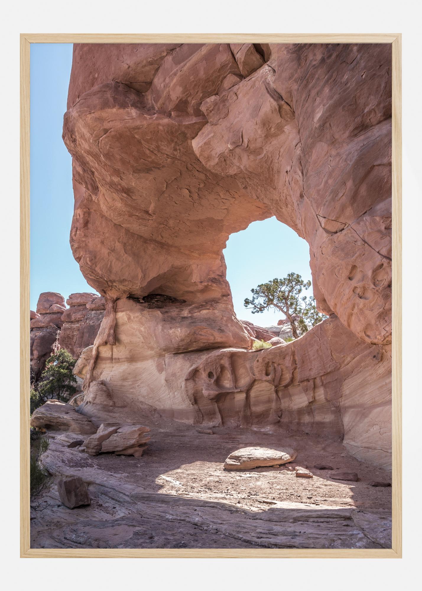 Působivý přírodní plakát s oranžovým kamenem s otvorem uprostřed. Na druhé straně otvoru se objevuje malý strom. Slunce svítí skrz otvor ve skále a vytváří stínovanou oblast před skálou. Krásné silné barvy jsou ideální pro rozjasnění nudné místnosti.