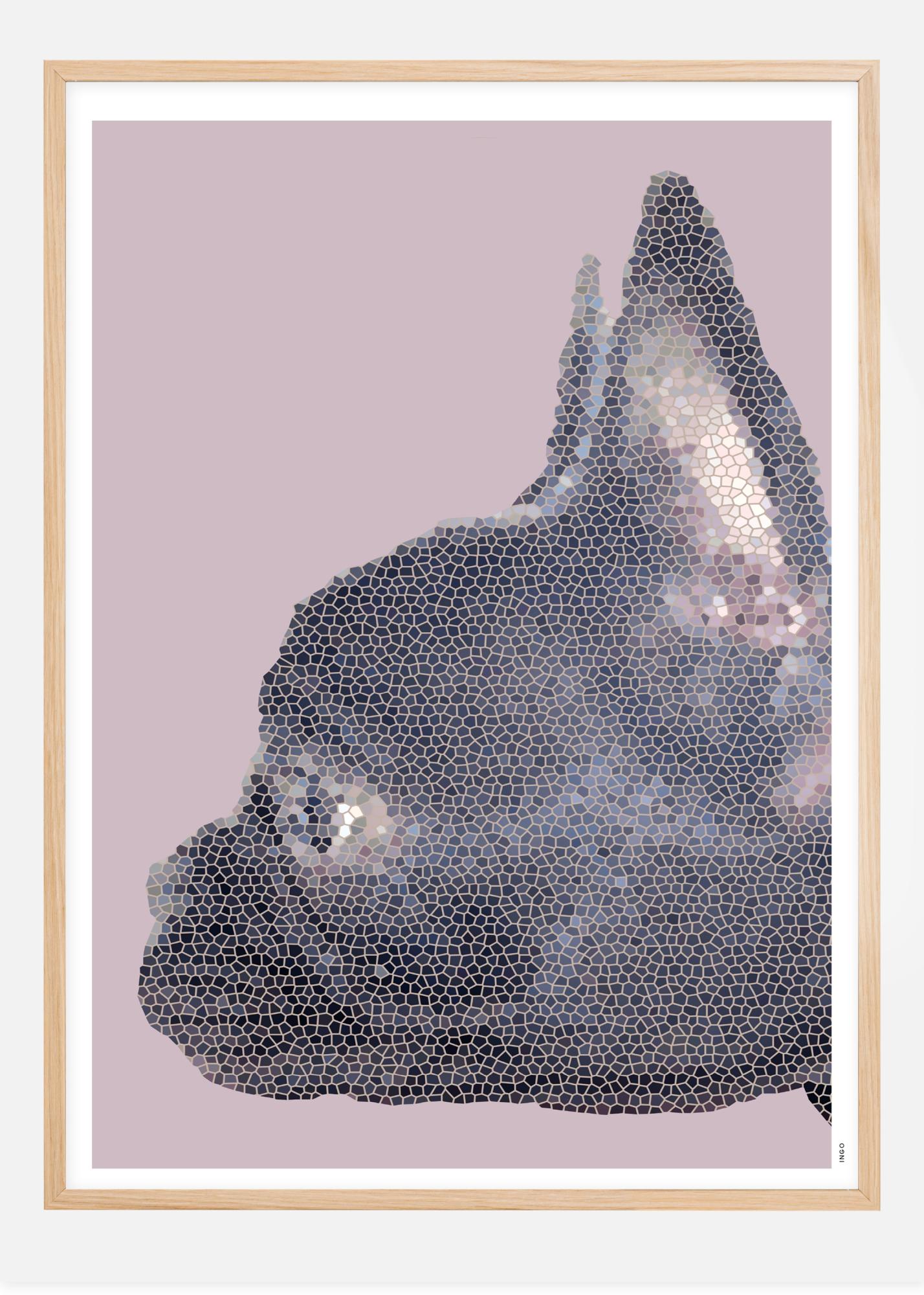 Mozaikový tisk v černé a bílé s kavalír king charles španělem. Na růžovém pozadí se přirozené světlo odráží na uchu a oku psa. Se svou silnou čelistní linií a špičatými ušima pes hledí vlevo od tisku, jako by se díval na někoho. Krásný plakát, který je ideální pro milovníky zvířat.