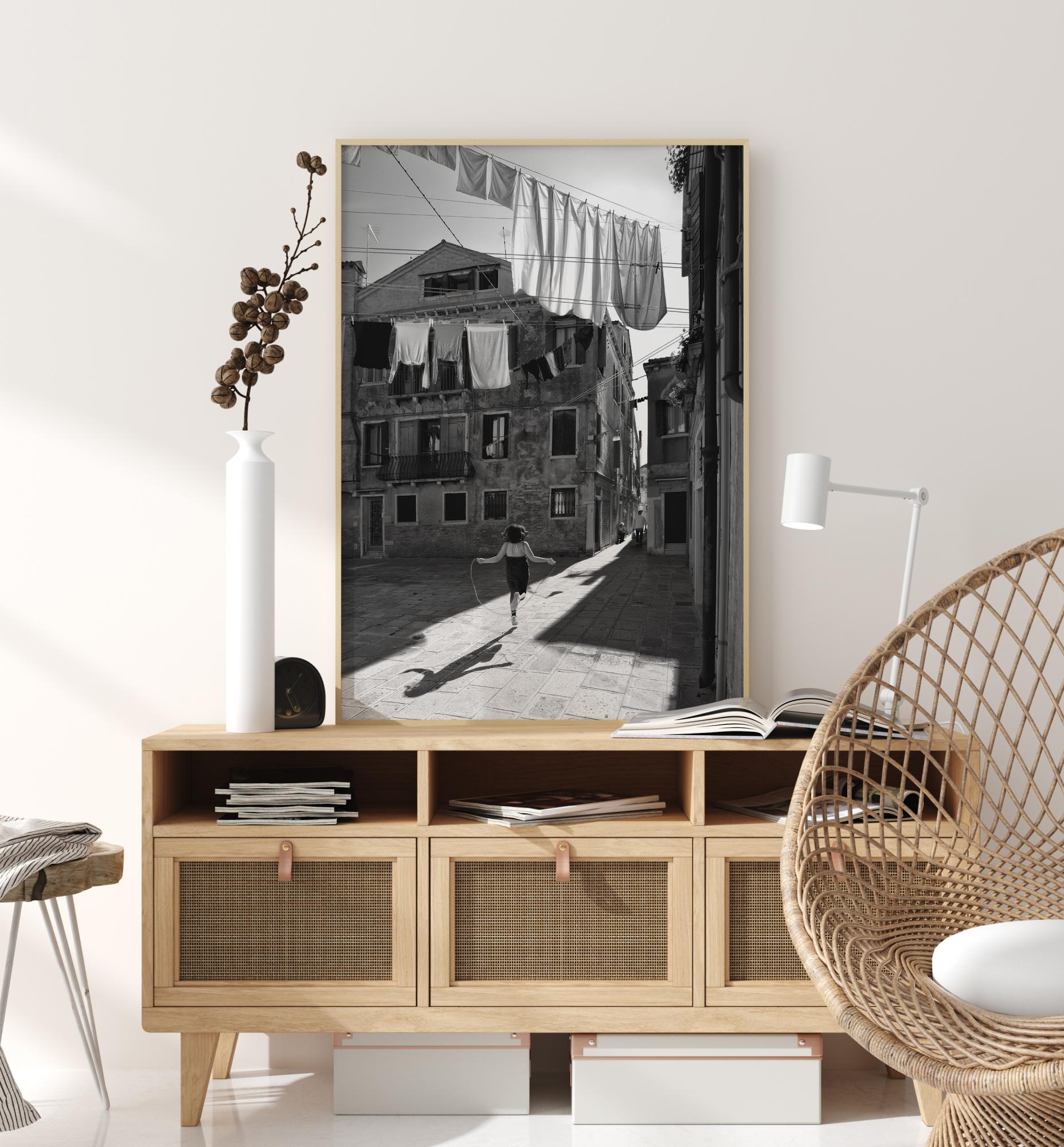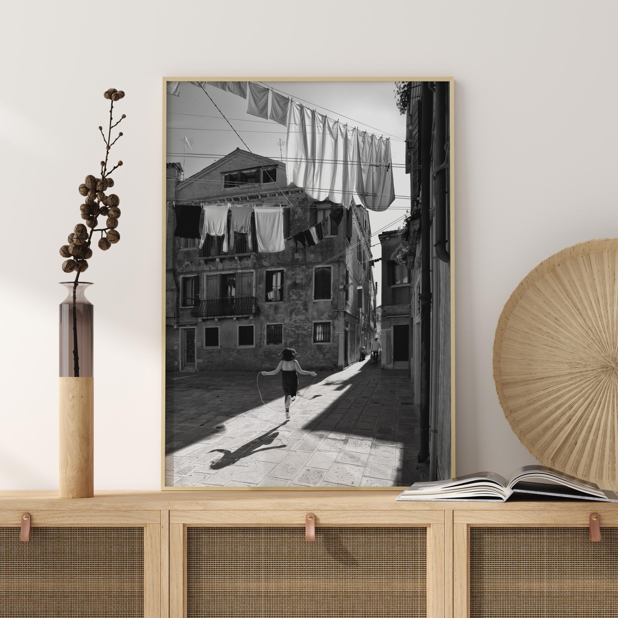 Nádherný plakát s mladou dívkou skákající přes švihadlo mezi domy a prádlem. Světlý sluneční paprsek ji zasáhne a vrhá její stín za ní. Dodejte svému domovu pocit nevinného úžasu pomocí tohoto obrázku.
