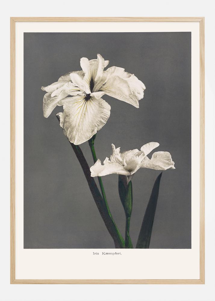 Tento elegantní plakát představuje Iris Kaempferi, známou také jako japonský kosatec, v odstínech bledého zlata a bílé na jemném šedém pozadí, které zvýrazňuje sochařské kvality těchto okouzlujících květin. Detaily struktury květů jsou jemně zdůrazněny stíny a světlem, které hrají přes okvětní lístky, zatímco tmavé, téměř černé tahy v srdci květu dodávají hloubku a rozměr. Harmonická kombinace barvy a tvaru, která znovu vytváří přirozenou krásu těchto květin.