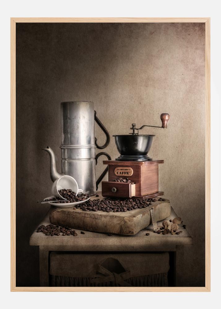 Potisk s kávovou tématikou s mlýnkem na kávu, konvicí na kávu, kávovými zrny a bílým šálkem s podšálkem. Jemné hnědé tóny tohoto potisku vytvářejí uvolňující obraz, kde téměř můžete cítit vůni nádherných pražených kávových zrn. Perfektní obraz k pověšení ve vaší kuchyni.