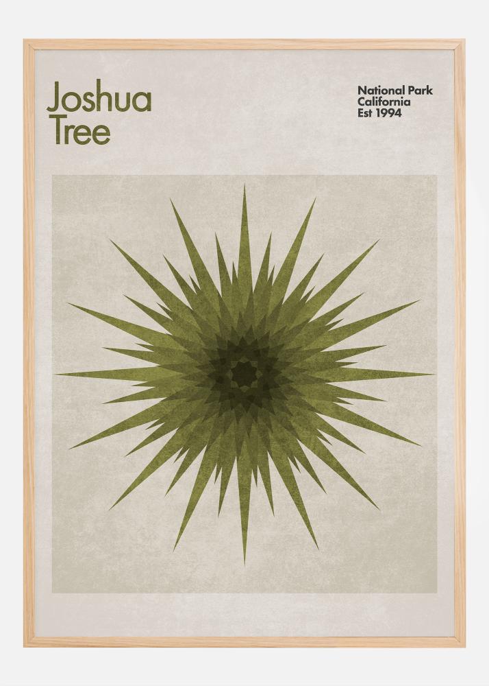 Tento náladový plakát představuje abstraktní interpretaci ikonického Joshua Tree, které je ústředním a výrazným prvkem ve středu obrazu. Hluboká zelená barva v motivu evokuje uklidňující přírodu a robustní pouštní krajinu, která je domovem tohoto stromu. Abstrakce stromu, s jeho roztaženými špičkami, vytváří téměř hypnotizující vzor, který je současný i nadčasový.
