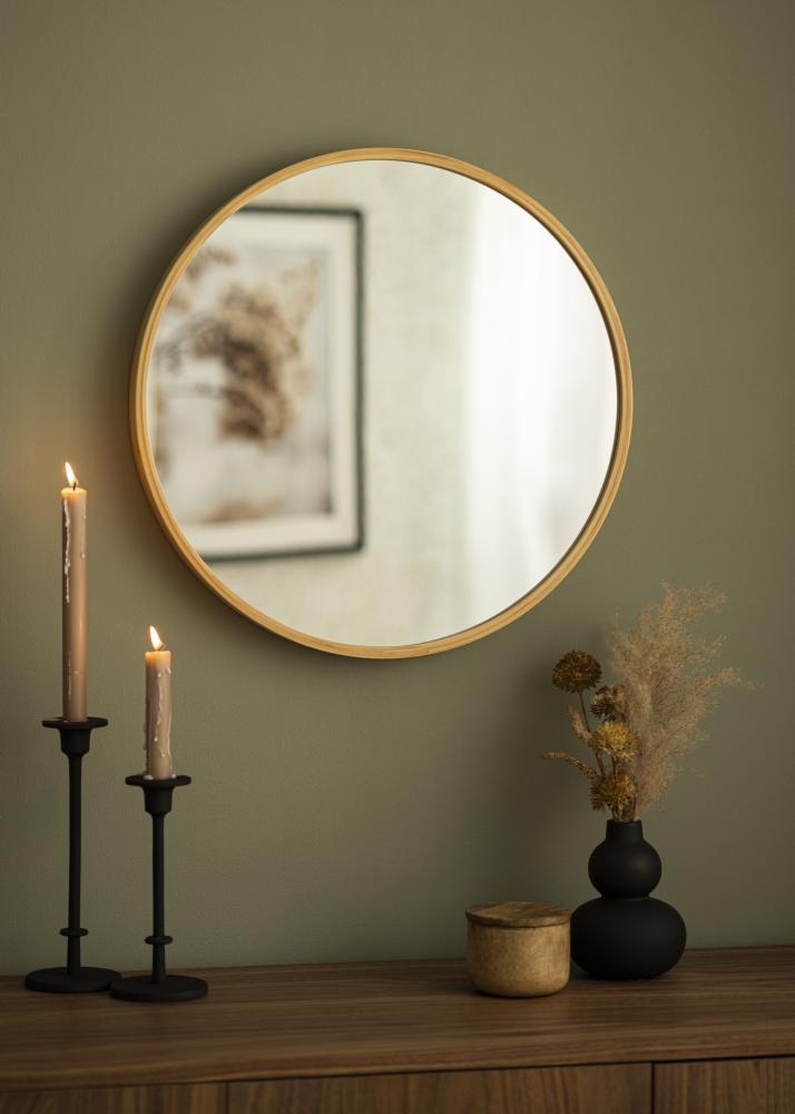 Toto je kulaté zrcadlo s okrajem ze světlého dřeva. Toto nástěnné zrcadlo se skvěle hodí pro ty, kteří preferují zemitý a moderní styl interiéru. Dekorativní prvky v přírodní designu, jako je toto zrcadlo, přispívají k útulné a příjemné atmosféře vašeho domova. Držák na stěnu je k dispozici. Zrcadlo má průměr 50 cm.