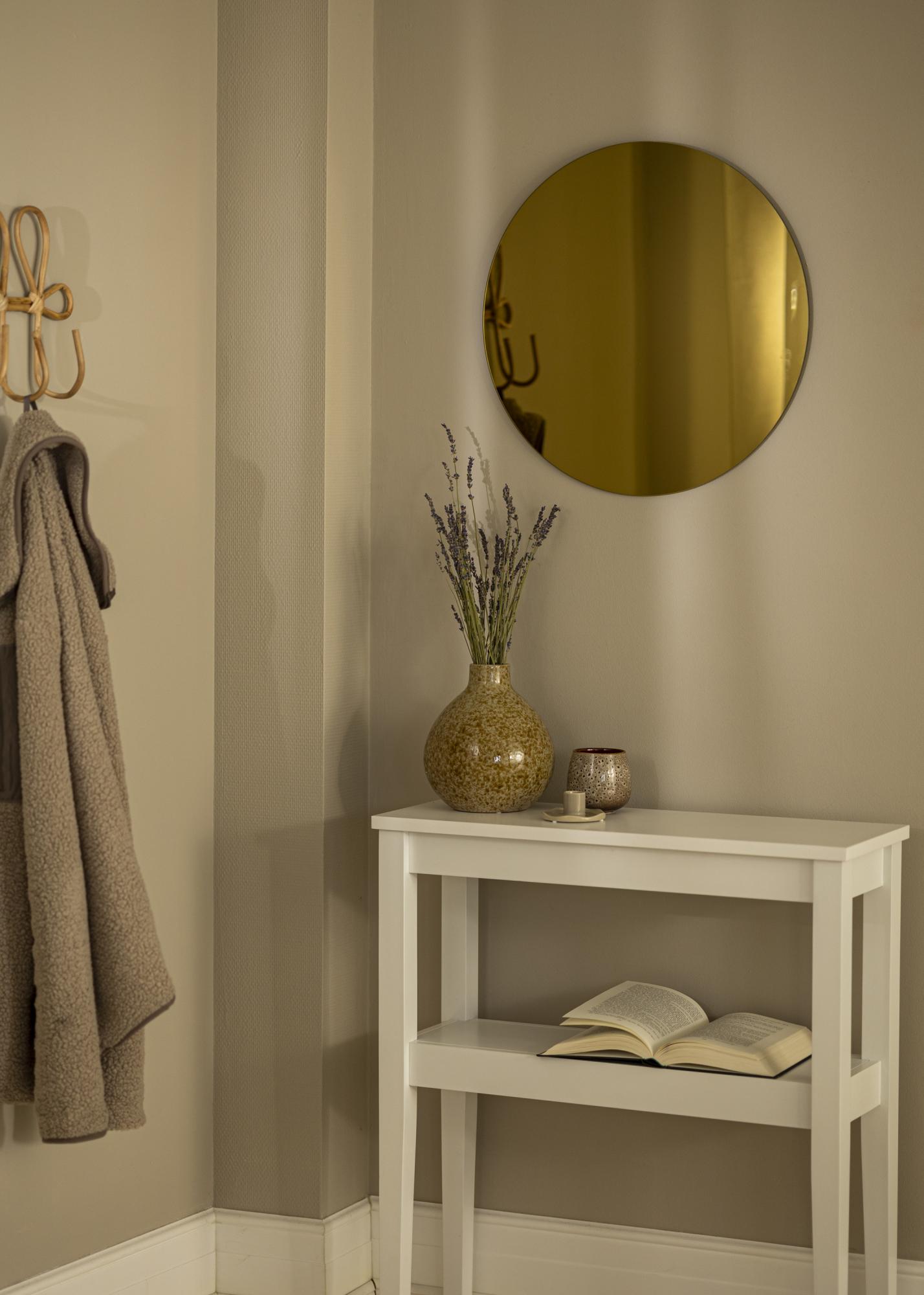 KAILA Kulaté Zrcadlo Gold je perfektním příkladem toho, jak dobře to může vypadat, když se čistý tvar setká s efektivními detaily. Toto kulaté zrcadlo je tenké a nemá žádný rám, což mu dodává moderní a minimalistický vzhled. Toto je kombinováno s krásným zlatým tónovaným zrcadlovým sklem, které povznáší celek a činí zrcadlo vkusně nápadným.