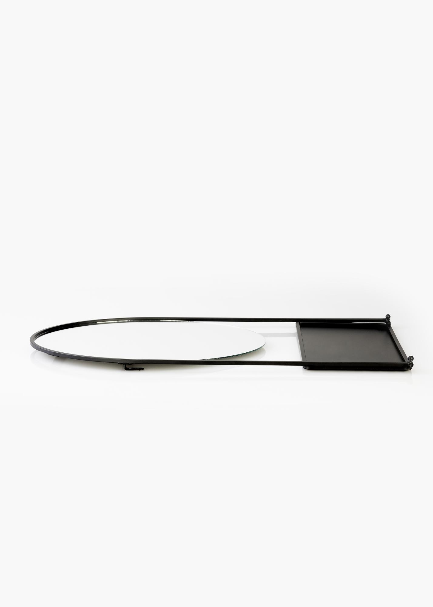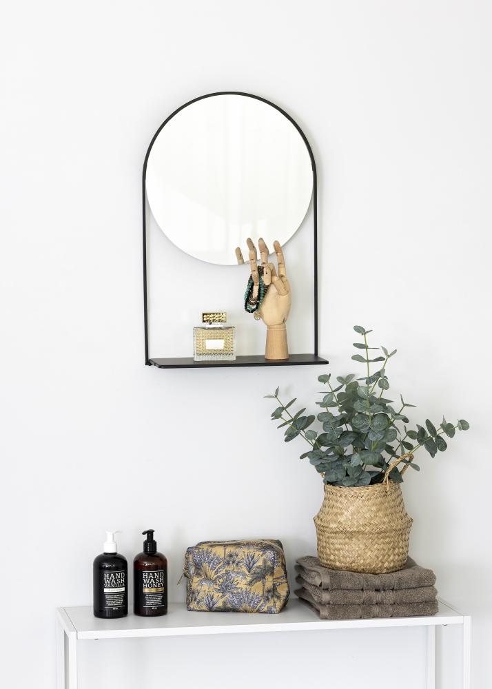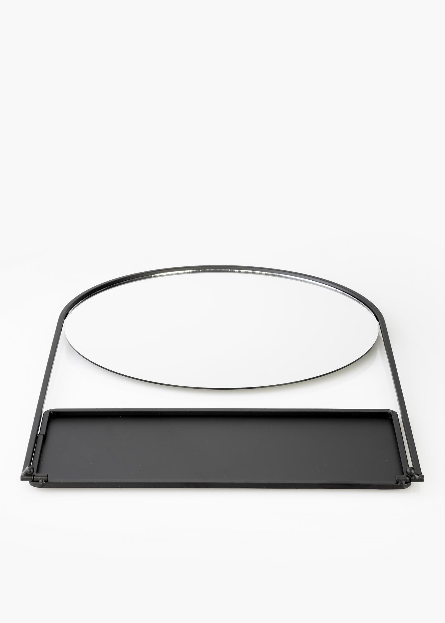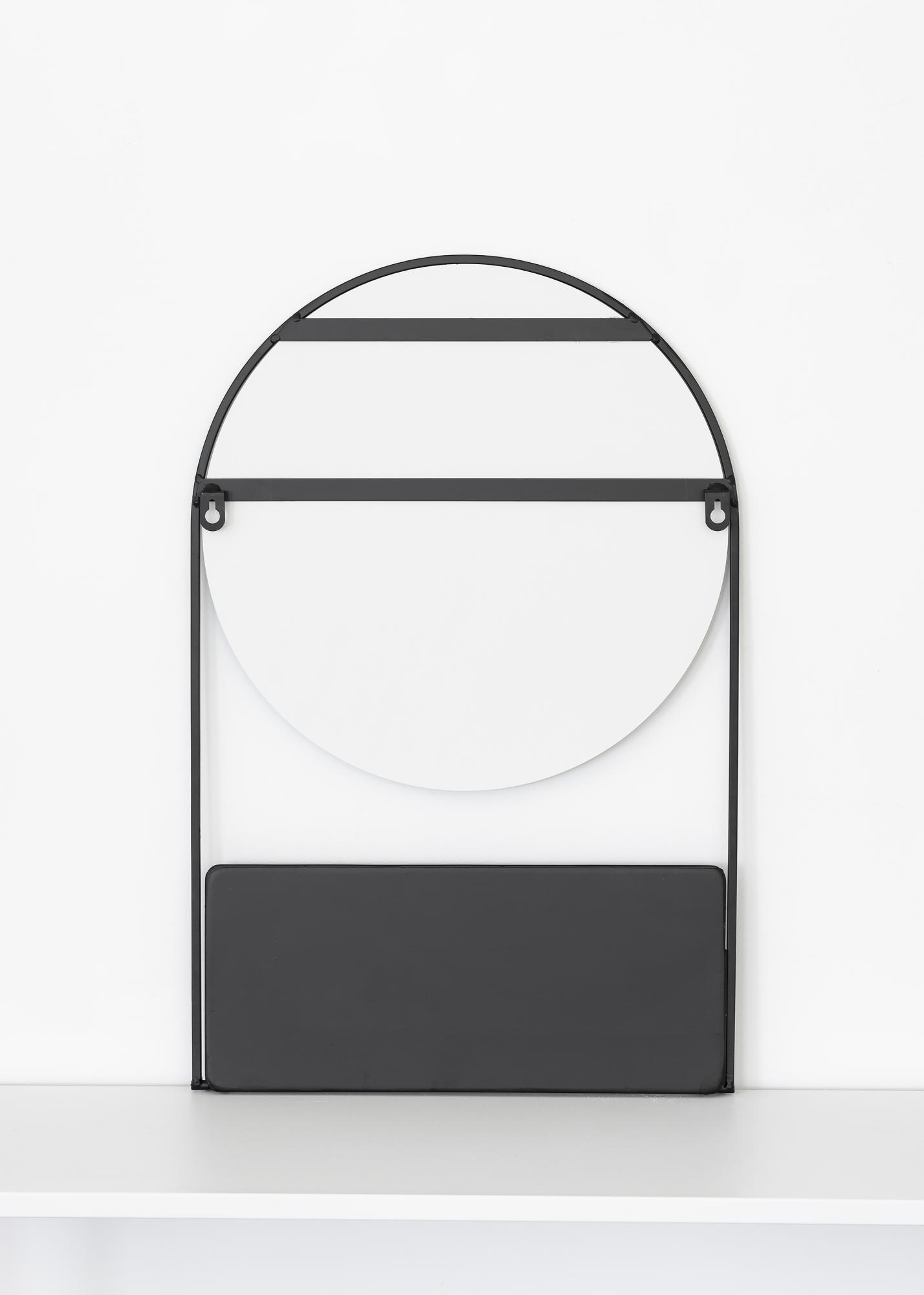 Tento stylový nástěnný zrcadlo s policí je švédský design od KAILA. Zrcadlo je v černé barvě a je vyrobeno z kovu. Samotná zrcadlová plocha je kulatá a má průměr 35 cm. Kolem zrcadlové plochy je černý kovový okraj a na spodní části je police - ideální pro umístění krásné dekorace nebo malého úložného prostoru na make-up! Zrcadlo měří 35x55 cm a má nástěnný úchyt.