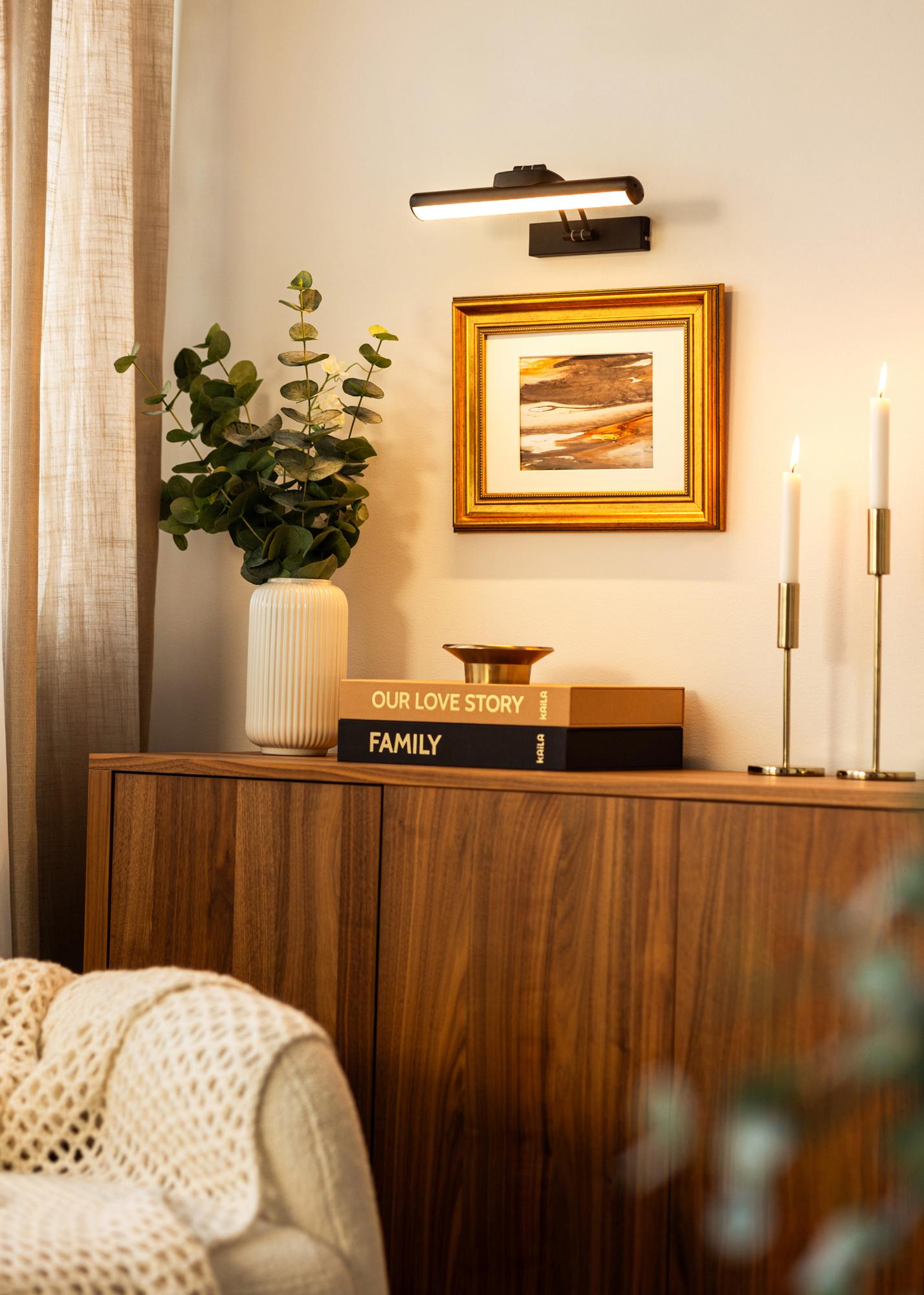 KAILA Luster je elegantní a bateriové obrazové osvětlení v černé barvě, ideální pro zvýraznění vašich obrazů bez rušivých kabelů. Díky bezdrátovému designu můžete lampu namontovat snadno a volně, aniž byste museli myslet na elektrické zásuvky. Elegantní černý povrch poskytuje moderní a sofistikovaný vzhled, zatímco rovnoměrné světlo vytváří krásné nasvícení vašeho umění. Snadná instalace a pohodlné použití – praktické řešení, které dává vašim obrazům pozornost, kterou si zaslouží.