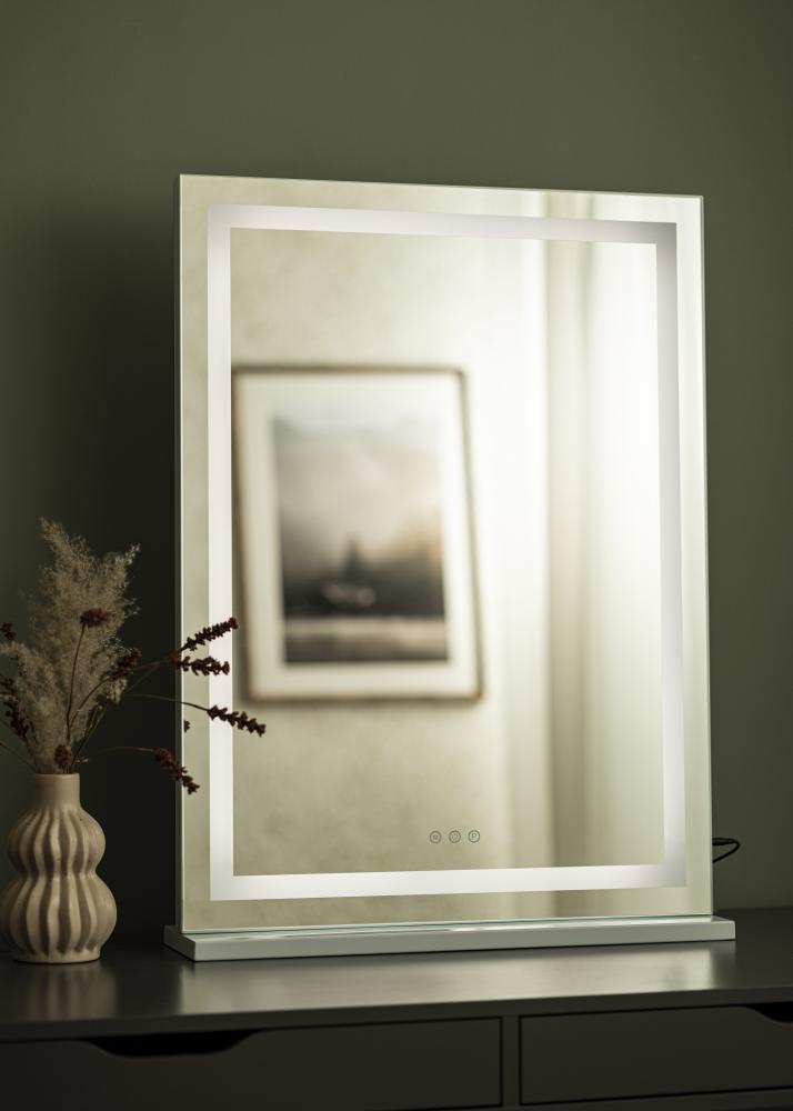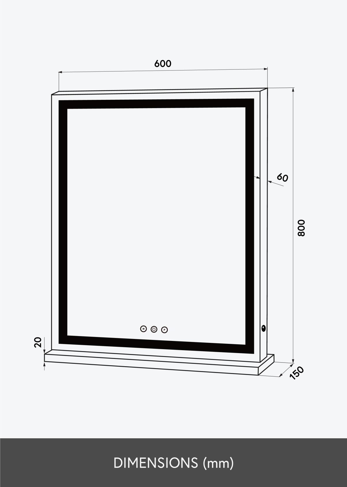 Tento kosmetické zrcadlo je perfektní kombinací minimalismu a trendovosti. Má klasický tvar a moderní LED pásek, který vytváří rám kolem 80x60 cm velké zrcadlové plochy. Zrcadlo má stojan, který lze demontovat, takže si můžete zvolit, zda chcete mít zrcadlo stojící na stole nebo zavěšené na zdi. Montuje se ve vertikální poloze.
