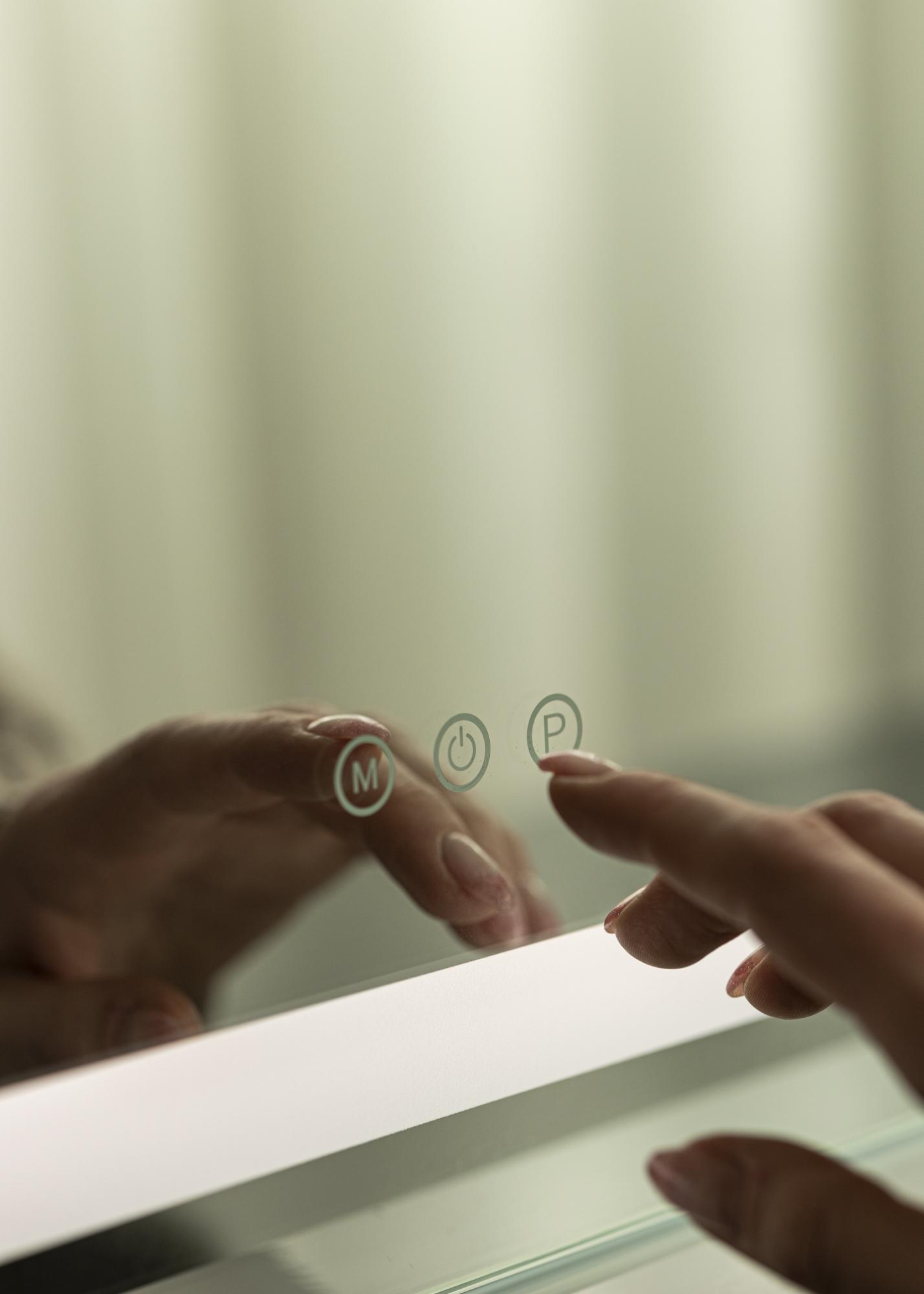Na dolním okraji zrcadla jsou tři dotyková tlačítka - jedno, které zapíná a vypíná osvětlení, a dvě, která mění nastavení světla. Tlačítko „M“ upravuje barevnou teplotu světla mezi 3000K-6000K, a tlačítko „P“ stmívá osvětlení. Jinými slovy, můžete nastavit perfektní osvětlení pro každou příležitost.