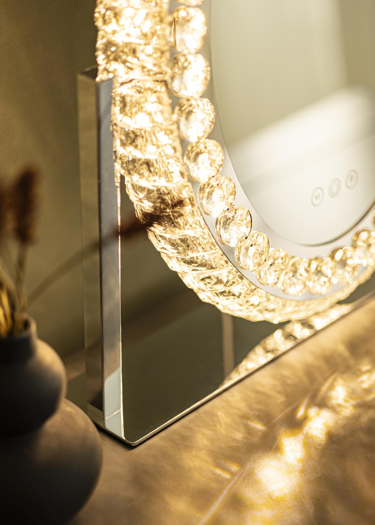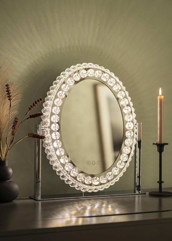 Toto je zrcadlo na líčení v klasickém stylu, s dekorativním rámem a LED osvětlením. Oválný tvar zrcadla a rám s krystalovými ozdobami mu dodávají luxusní vzhled, který se hodí jak do ložnice, tak do obývacího pokoje. Je vyrobeno z nerezové oceli a má stojanový design.
