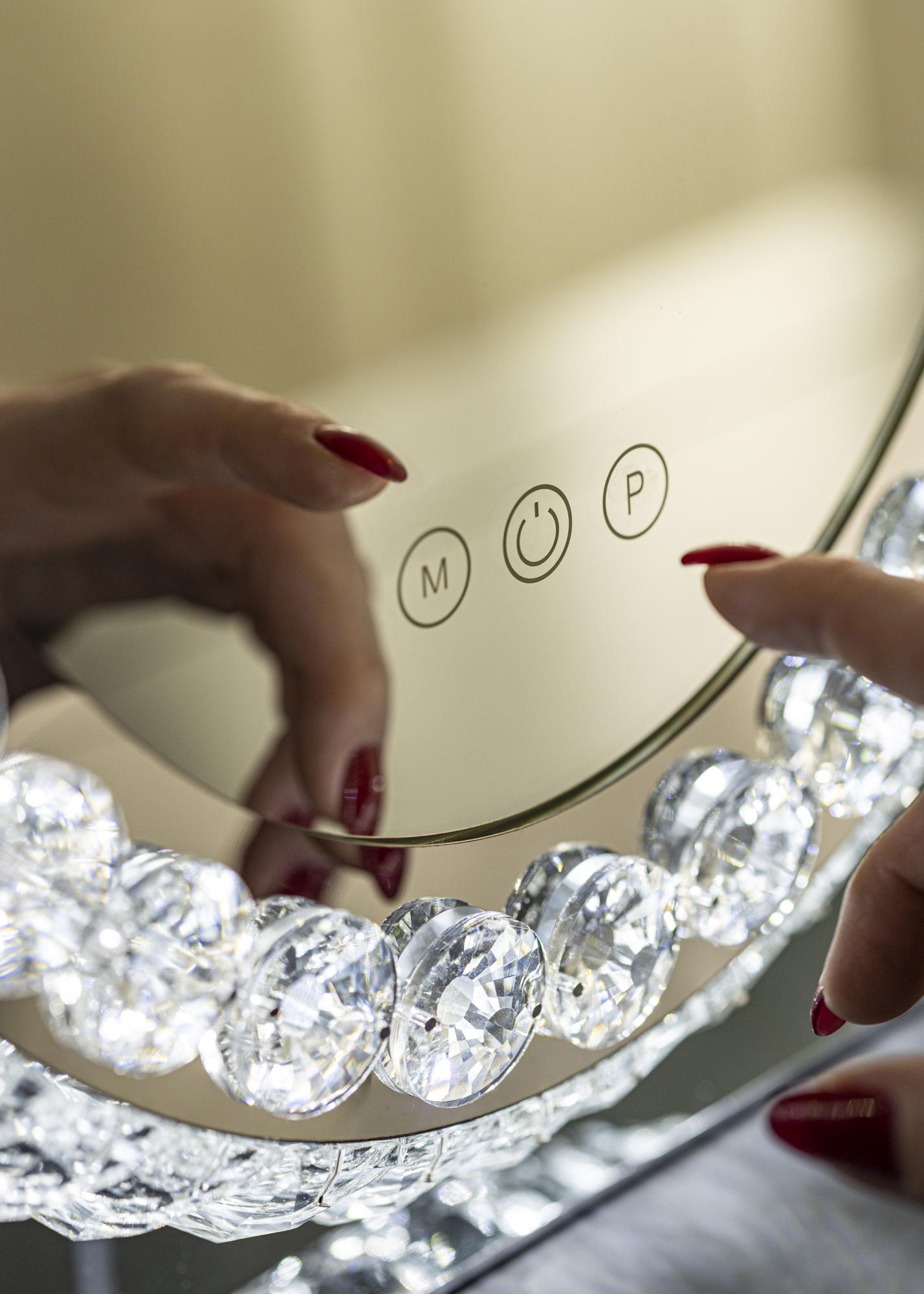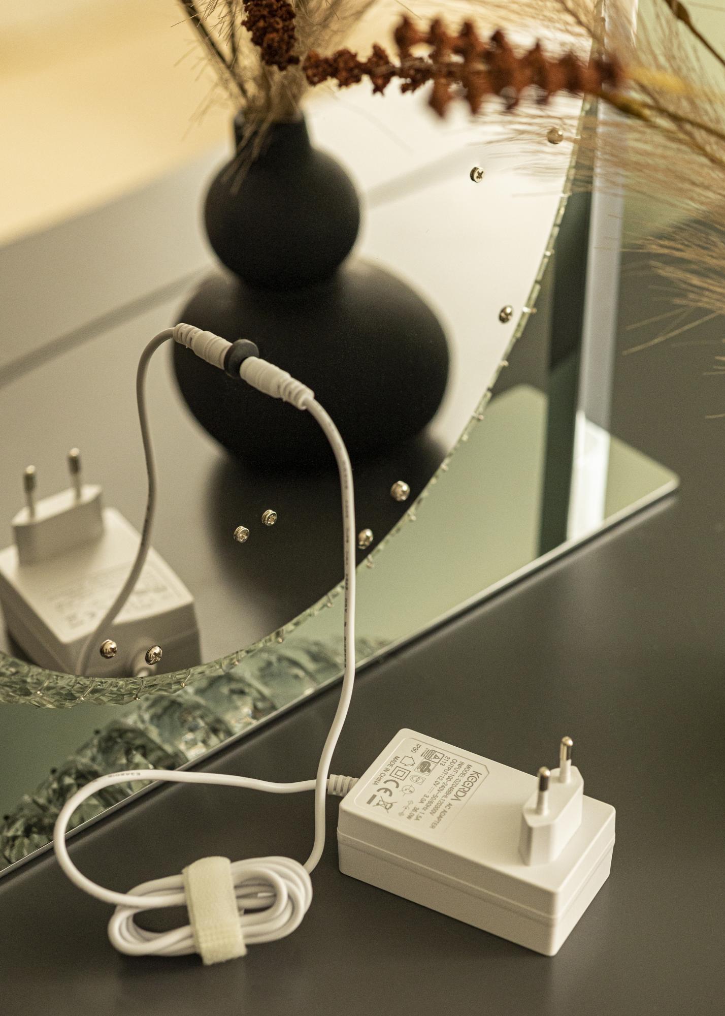 Vestavěné LED osvětlení poskytuje příjemné světlo – ideální při aplikaci makeupu a přípravě na den. Světlo lze navíc upravit pomocí dotykových tlačítek na spodním okraji zrcadla. Pomocí tlačítka "M" můžete změnit barevnou teplotu osvětlení a s tlačítkem "P" ztlumit světlo na požadovanou intenzitu. K dispozici je také vypínač pro zapnutí a vypnutí osvětlení zrcadla. Elektrické připojení se provádí pomocí zástrčky.