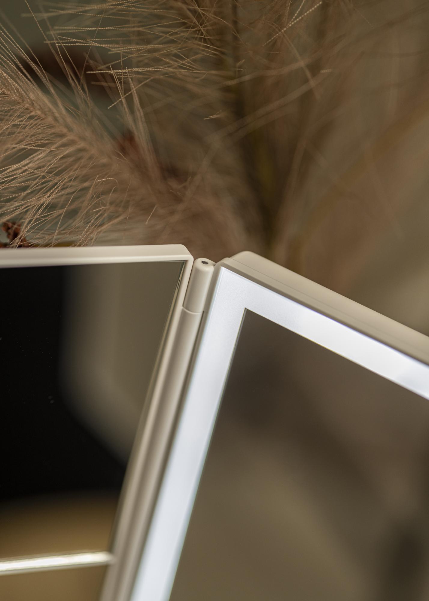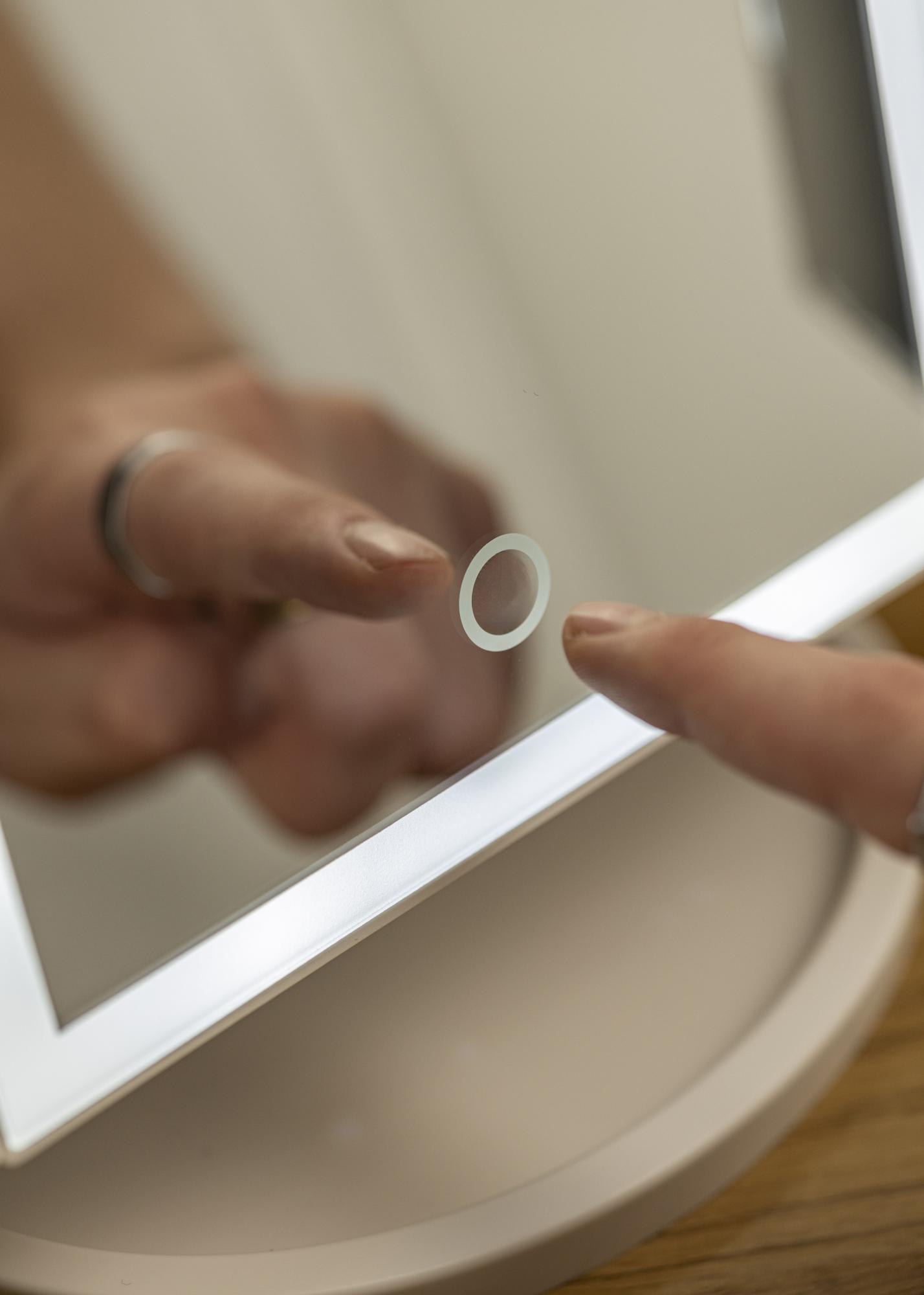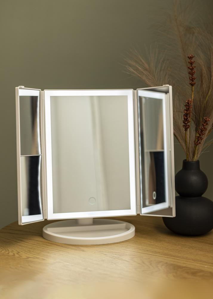 Trendy a stylové make-up zrcadlo na stojanu se čtyřmi různými zrcadly a stmívatelným LED osvětlením. Levá strana make-up zrcadla má zvětšující zrcadlové sklo s 2x a 3x zoomem. Integrované LED osvětlení elegantně rámuje větší zrcadlo uprostřed a poskytuje příjemné teplé bílé světlo o 3000K. Osvětlení snadno zapnete stisknutím dotykového tlačítka na obrazovce a jednoduše nastavíte jeho intenzitu přidržením tlačítka na několik sekund. Zrcadlo měří 38x30 cm a lze jej naklánět, což vám umožní se odrážet z různých úhlů.