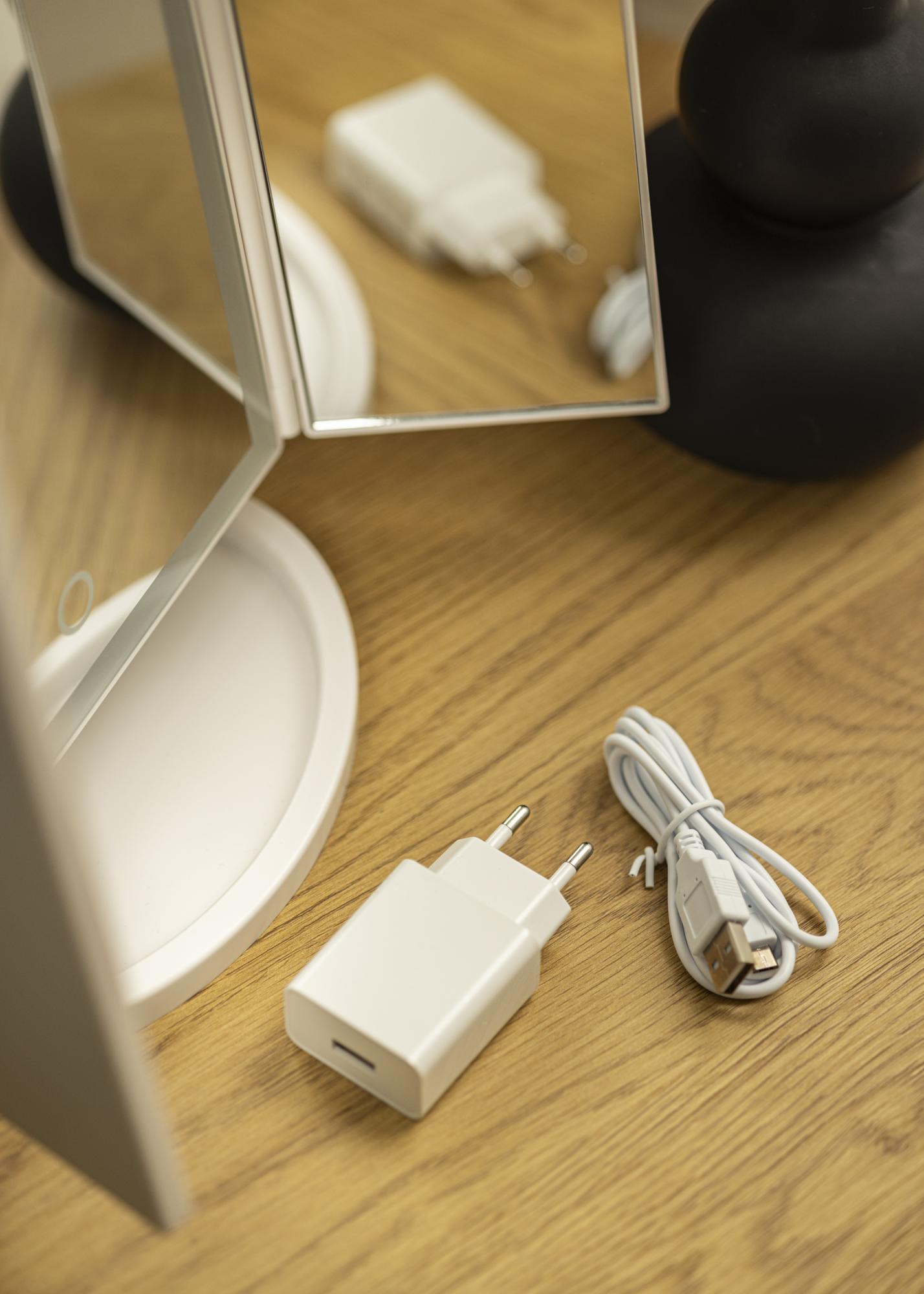 Zrcadlo je napájeno 4x AA bateriemi (nejsou součástí balení) nebo nabíjeno pomocí přiloženého USB nástěnného adaptéru a USB kabelu.