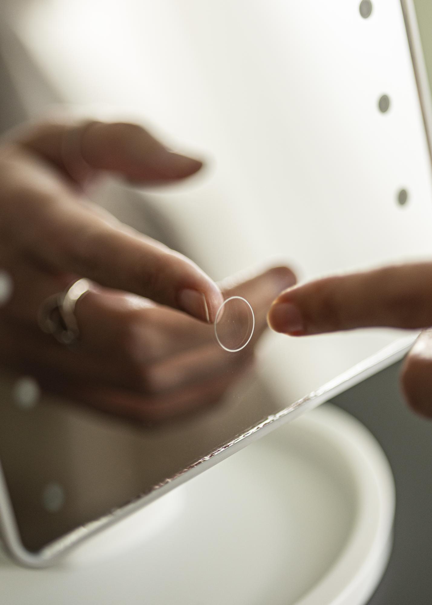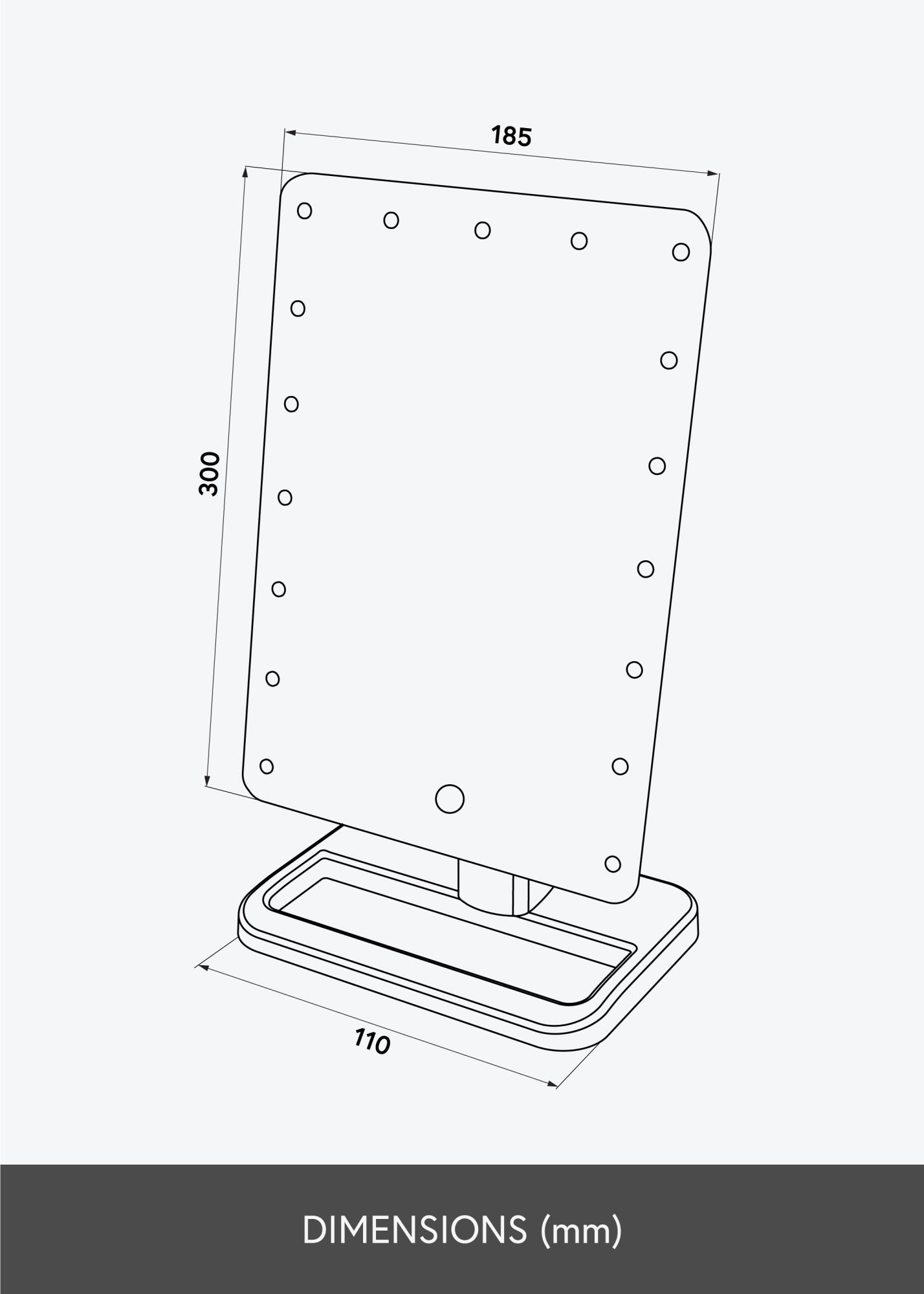 Zrcadlo má integrované LED osvětlení, které se zapíná/vypíná tlačítkem na zadní straně. Osvětlení poskytuje studené bílé světlo, které lze stmívat. Pro nastavení jasu podržte dotykové tlačítko na přední straně zrcadla po několik sekund. Bateriově napájené zrcadlo je napájeno 4x AA bateriemi, které se prodávají samostatně.